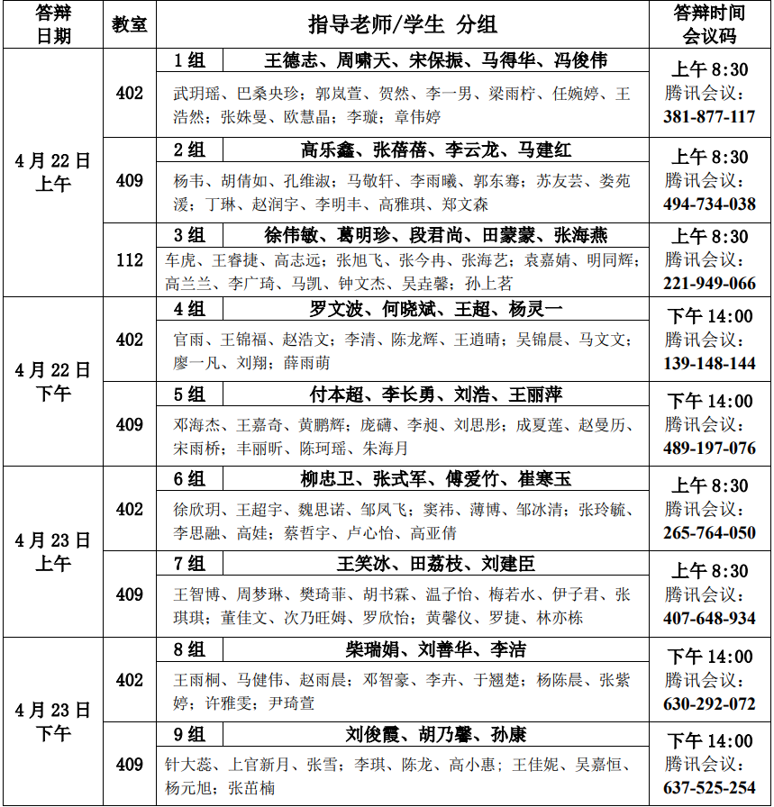 二、答辩时间和线上答辩平台如下,具体结束时间由各答辩组自行掌握: