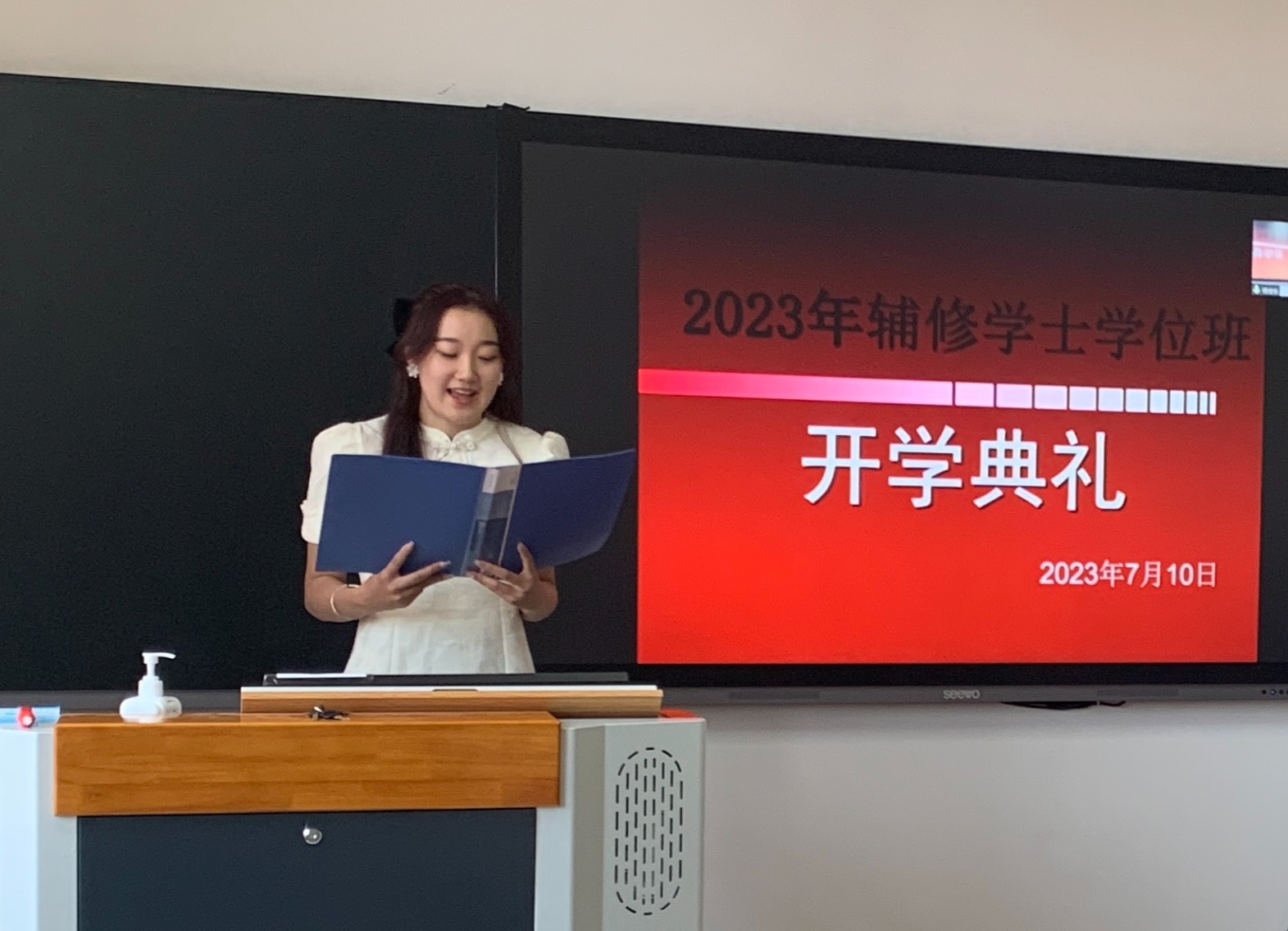新生代表2022级外国语学院的杨佳怡同学发言,她讲述了自己辅修法学的原因,希望在未来能够从事高端涉法法律事务,成为复合型涉外法律人才,并阐述了学习法学辅修的优势,最后希望大家一起努力进步,怀揣梦想,砥砺前行。