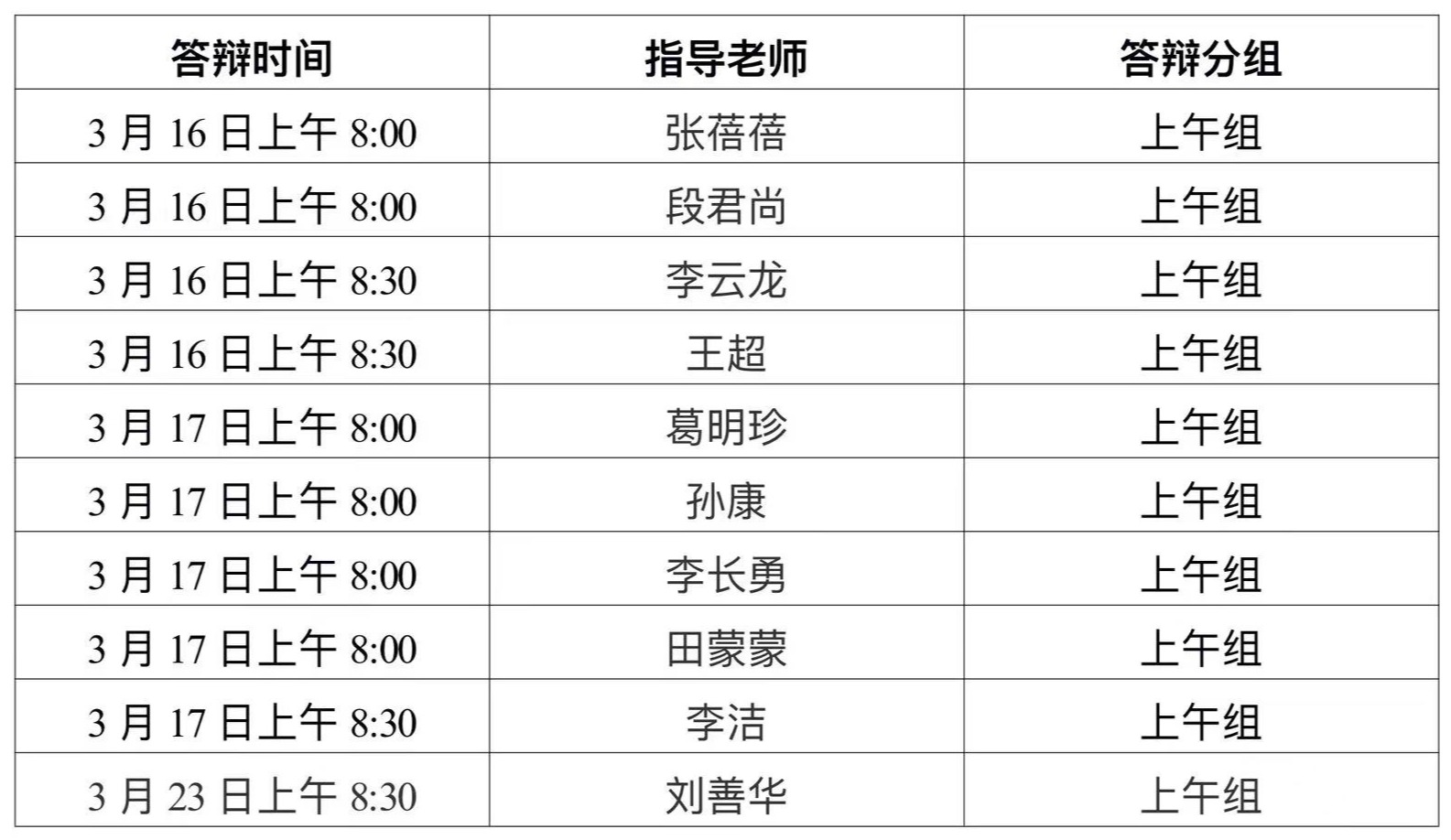 三、答辩组及答辩人数不统一,我们只统一答辩开始时间,答辩结束时间由答辩组自定。如有变更,以答辩组老师通知为准。