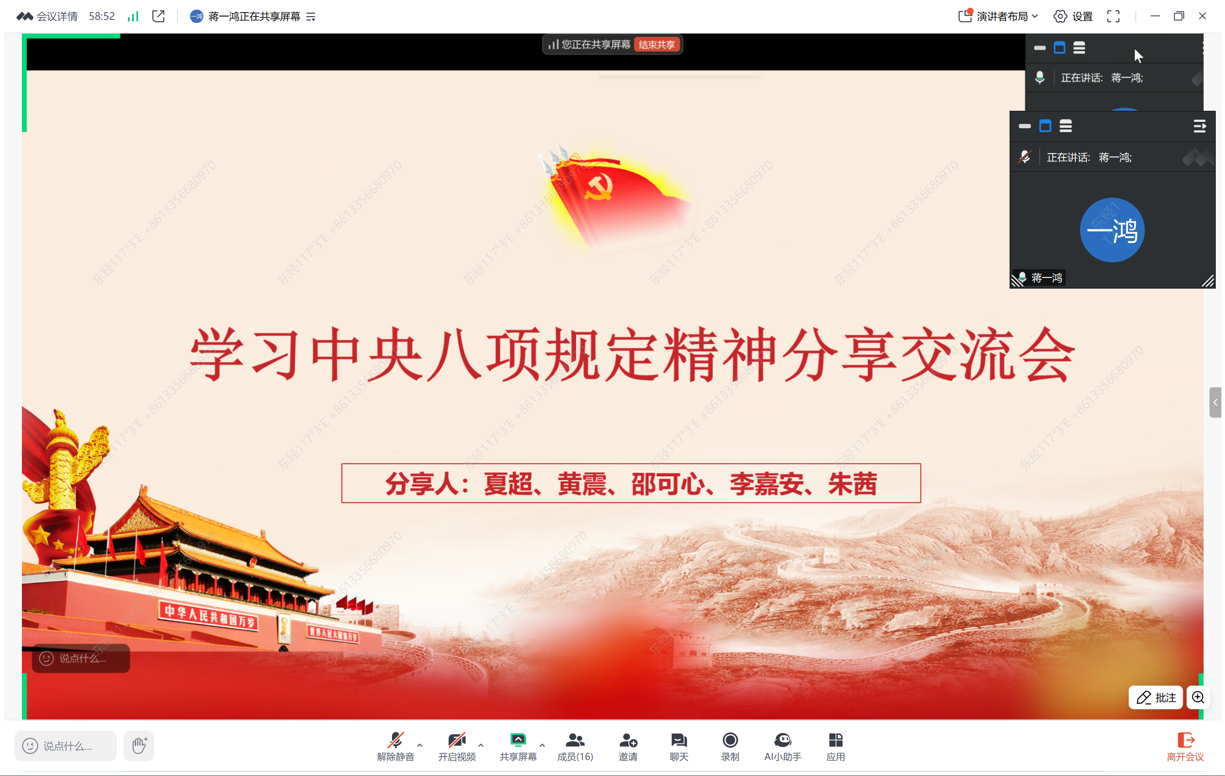 为深入贯彻落实中央八项规定精神,持续推进理论学习与支部建设走深走实,法学硕士第二党支部于5月15日组织开展学习中央八项规定精神分享交流会。本次分享会以线上线下相结合的形式开展,支部全体党员通过思想碰撞与经验交流,进一步加强理论学习,增强担当作为。