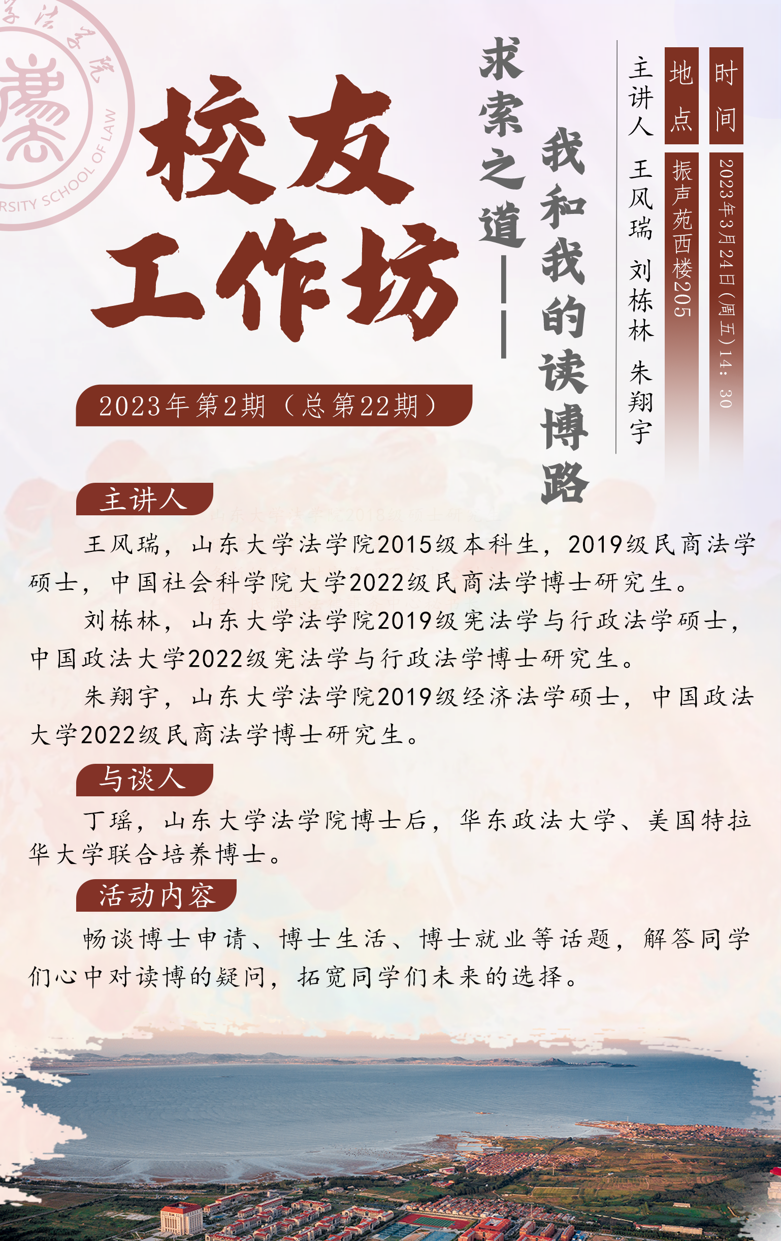 3月24日,taptap点点体育校友工作坊2023年第2期邀请到2015级本科生、2019级民商法学硕士研究生王风瑞,2019级宪法学与行政法学硕士研究生刘栋林,2019级经济法学硕士研究生朱翔宇,三位校友以“求索之道——我和我的读博路”为主题分享了各自的申博、读博历程。taptap点点体育博士后丁瑶作为与谈人参加了活动。
