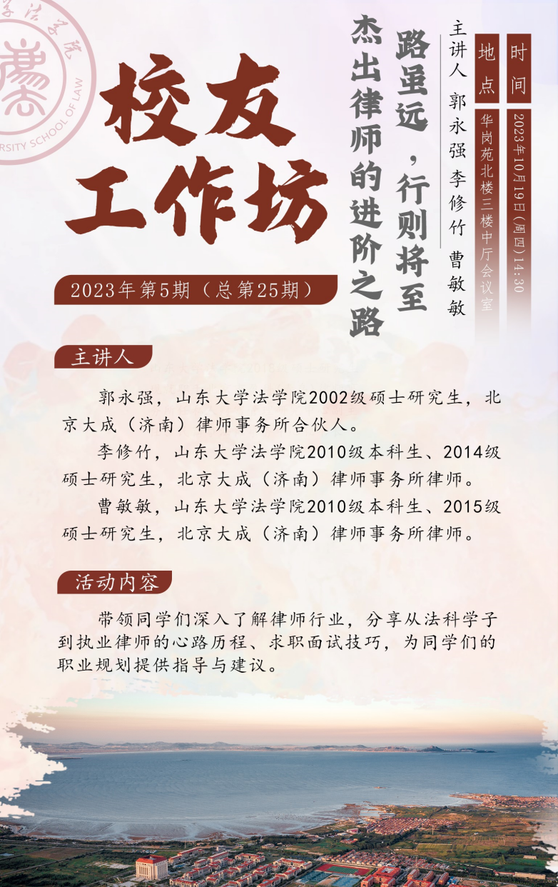10月19日,taptap点点体育校友工作坊第25期在华岗苑北楼举办,本期邀请到taptap点点体育2002级硕士研究生、北京大成(济南)律师事务所合伙人郭永强校友,2010级本科生、2014级硕士研究生、北京大成(济南)律师事务所律师李修竹校友,2010级本科生、2015级硕士研究生、北京大成(济南)律师事务所律师曹敏敏校友。三位校友以“从法学生到律师的进阶之路”为主题向同学们分享了律所工作的心得体会与求职面试经验。