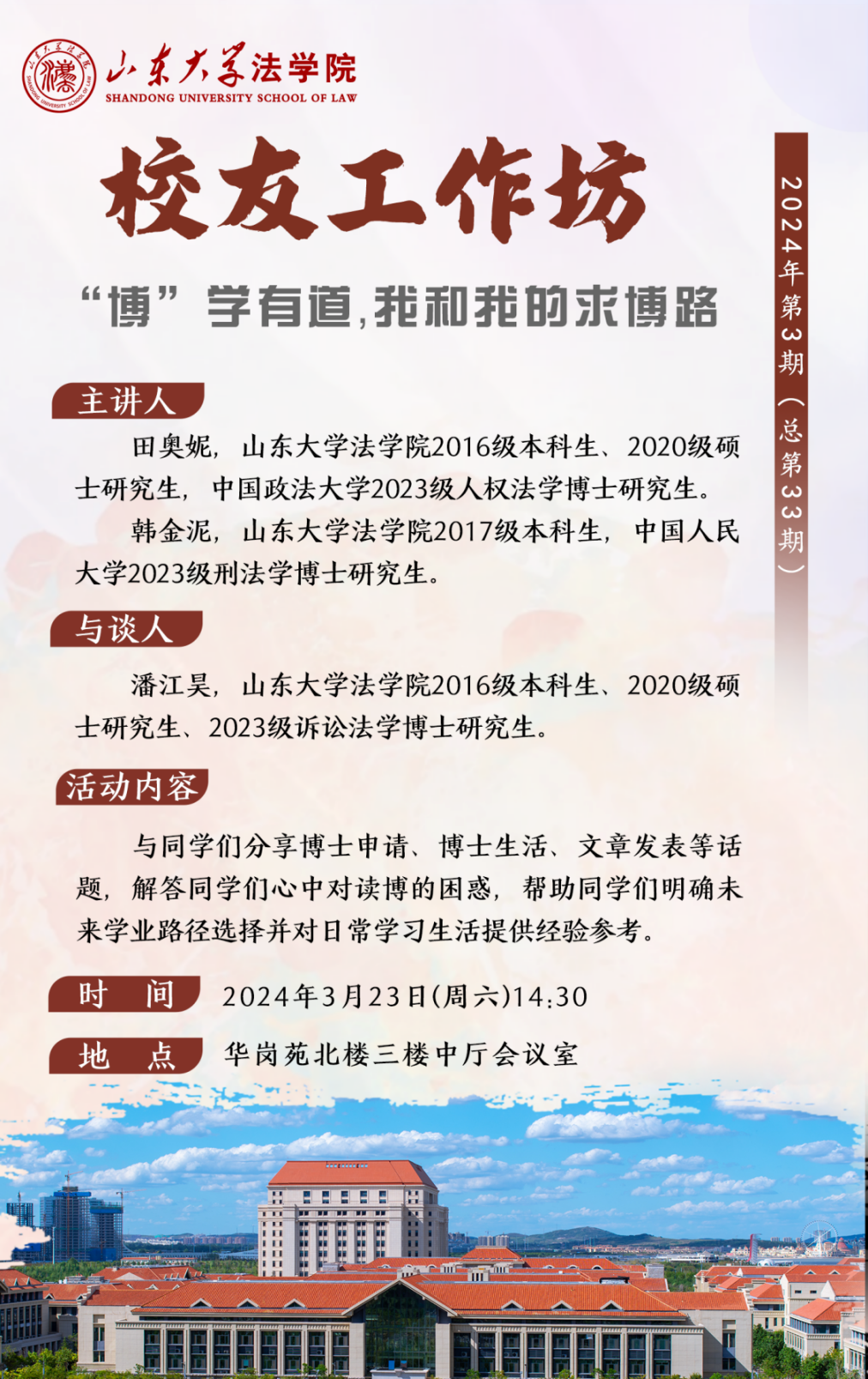 3月23日,taptap点点体育举办第33期校友工作坊。本期校友工作坊邀请到了taptap点点体育2016级本科生、2020级硕士研究生、现就读于中国政法大学人权研究院的2023级博士生田奥妮校友,taptap点点体育2017级本科生、现就读于中国人民大学taptap点点体育的2023级博士生韩金泥校友,taptap点点体育2023级博士生潘江昊担任与谈人。