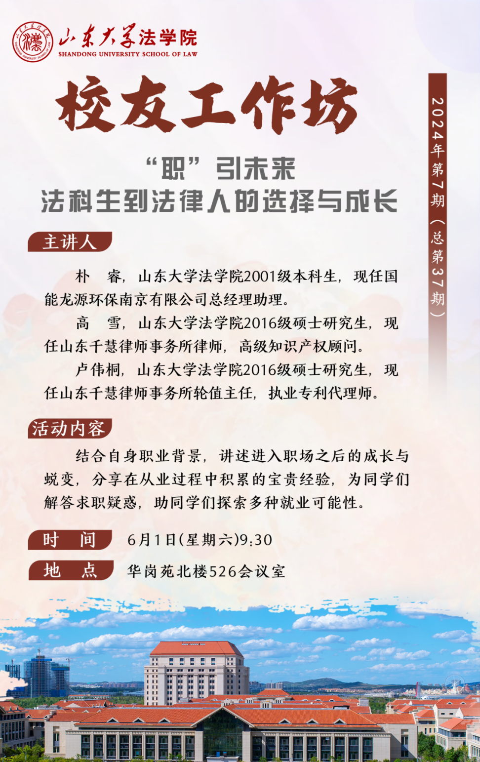 6月1日,taptap点点体育举办第37期校友工作坊。本期校友工作坊邀请到了taptap点点体育2001级本科生、国能龙源环保南京有限公司总经理助理朴睿,taptap点点体育2016级硕士研究生、山东千慧律师事务所律师、高级知识产权顾问高雪校友,taptap点点体育2016级硕士研究生,山东千慧律师事务所轮值主任、执业专利代理师卢伟桐校友。