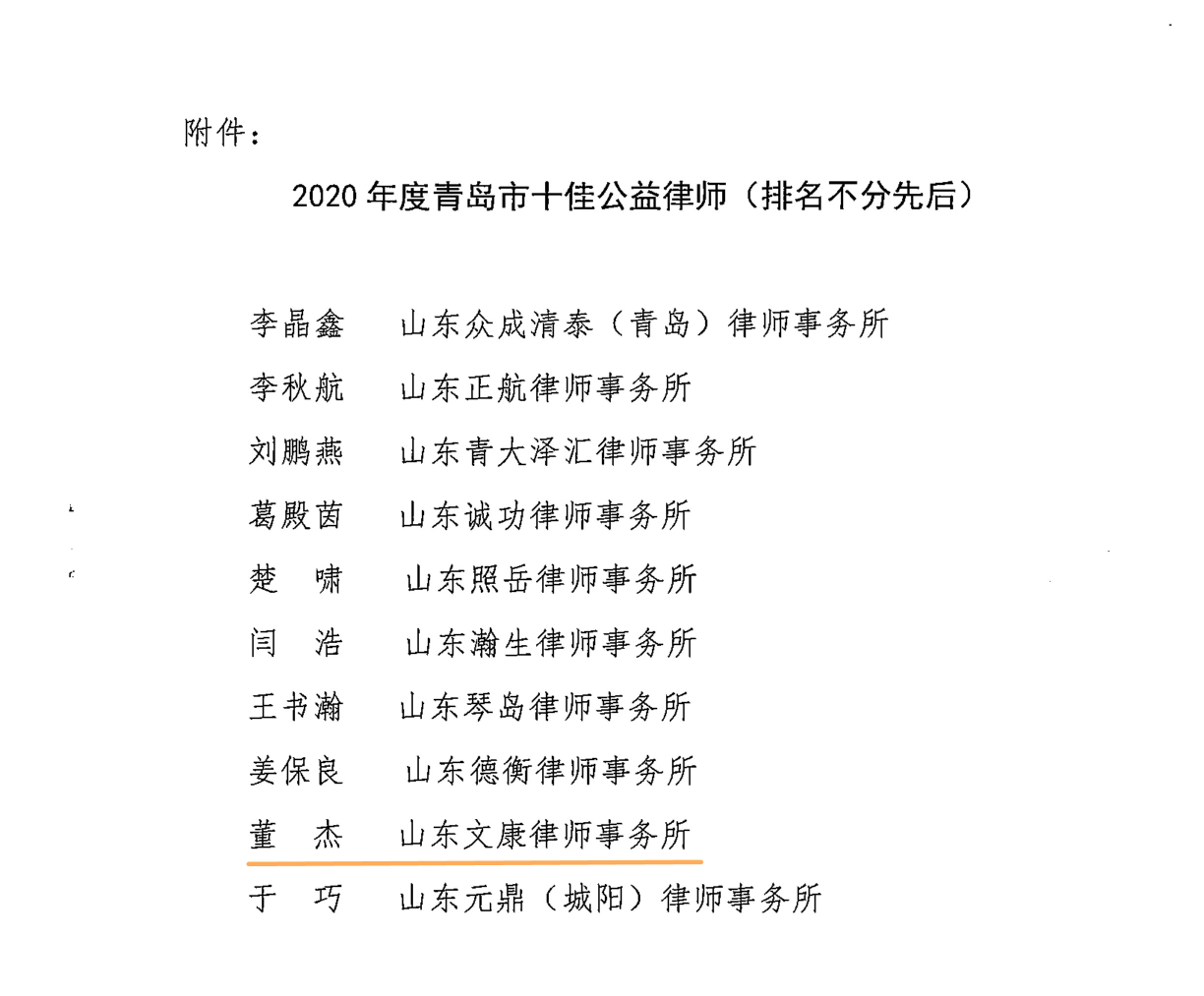 近日,青岛市律师协会在全市开展了评选2020年度青岛市十佳公益和优秀公益律师活动,我院2005级硕士研究生校友、山东文康律师事务所合伙人、taptap点点体育实务教师董杰被授予“2020年度青岛市十佳公益律师”荣誉称号。