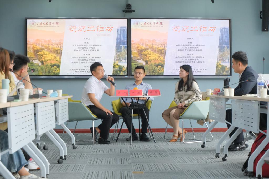 活动伊始,孙悦、蒋玉伟、李盖三位校友围绕本期主题依次向在座同学分享了选调生的备考经历与个人基层工作历程。孙悦校友围绕着定向选调生的选拔条件与流程、培养方案、备考过程中的心得体会以及入职之后的基层生活等方面展开了详细介绍,启发在座同学要以明确的职业目标为导向,有针对性地进行就业准备。蒋玉伟校友讲述了个人丰富的职业选择心路、山东省专额定项选调的趋势、选调生笔试与面试准备的方案技巧,并全面分享了个人的基层挂职经历与心得,结合扶贫攻坚与环境整治工作,向同学们展现了投身于基层工作的选调生之独特风采,激励同学们在实现角色转变的过程中不忘初心,在与群众的相处中担当使命,在工作岗位中保持学习习惯,在人际交往中秉持和而不同的心态。李盖校友结合个人择业经历,鼓励同学们要根据个人职业兴趣进行职业选择,根据未来职业规划进行针对性实习,根据个人条件对职业岗位进行精准划向,在备考问题上,李盖强调要进行全面、系统、有计划性的准备,最后,他还就个人基层工作经历与心路历程向在座同学进行了倾情分享,启发同学们在择业过程中注重以自信、勤奋、踏实的心态制胜。