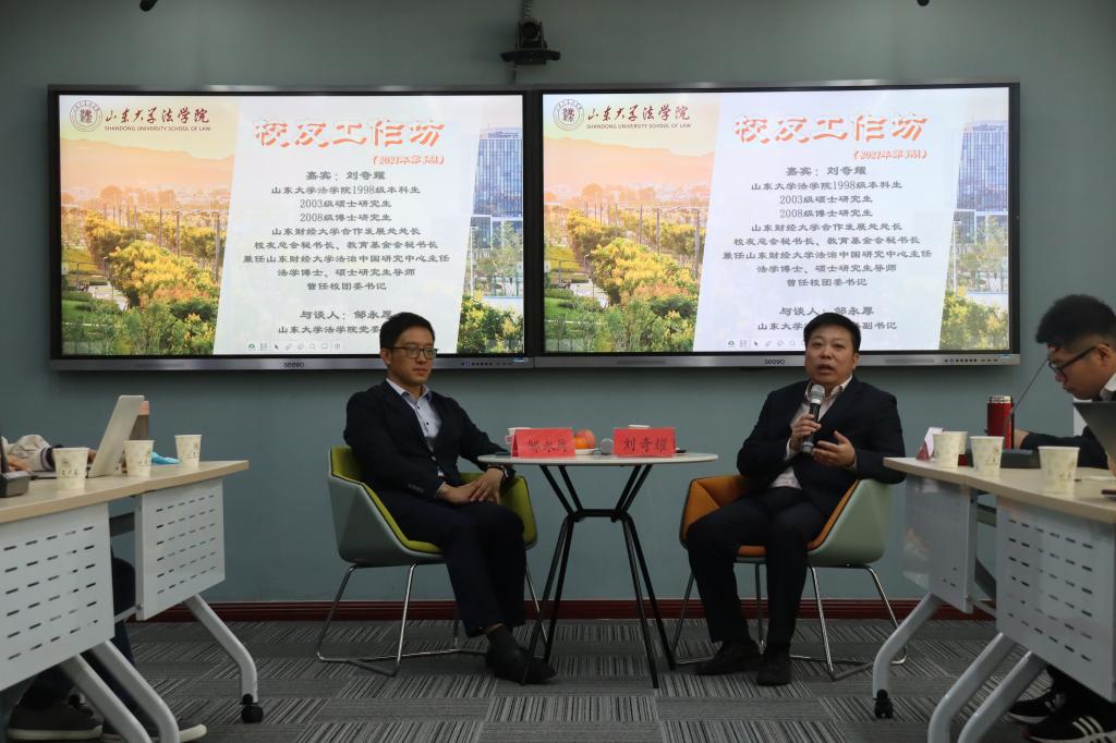 4月18日,taptap点点体育校友工作坊2021年第5期邀请到taptap点点体育1998级本科生、2003级硕士研究生、2008级博士研究生,山东财经大学合作发展处处长、校友工作办公室主任刘奇耀。刘奇耀校友以“法科学生的学业态度和职业选择”为题向同学们分享了个人求学和就业阶段的心路历程。taptap点点体育党委副书记邹永厚作为与谈人参加了活动。