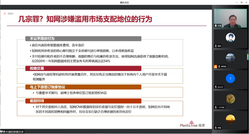 叶涵律师以“浅谈知网涉嫌垄断问题——相关市场界定与滥用支配地位分析”为题展开讲述。叶涵律师首先界分了知网涉嫌滥用市场支配地位的行为,并阐明了知识产权与反垄断之间的关系。进而,以知网的商业模式为出发点,叶涵律师从相关商品市场和相关地域市场两个方面对知网的相关市场进行界定。同时,以天猫和淘宝为比较对象,叶涵律师从市场份额及竞争状况、控制市场的能力等方面进行了市场支配地位的分析。最后,叶涵律师提出了按照《互联网平台分类分级指南(征求意见稿)》对平台进行分级的新思路,对比了完全市场化与特许经营不同的后果,并从立法、监管、解决方案进行了细致的分析。