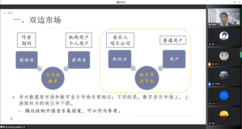 焦海涛教授首先指出学术数据库是典型的双边市场,并将其与数字音乐平台进行类比。对于相关市场的界定,焦海涛教授认为应根据数据库提供的服务来界定相关市场。以赵德馨状告知网案为切入点,焦海涛教授从作者利益与期刊角色的角度,详细解读了期刊约稿中数据库付费条款。最后,焦海涛教授提出了在双边市场中根据不同的问题采取行业监管与反垄断“双管齐下”的措施,同时针对传播受限,考虑知识的文化价值与传播需求,适度引入法定许可,思考回归“知识基础设施工程”属性,按“公用事业”监管的综合治理方案。
