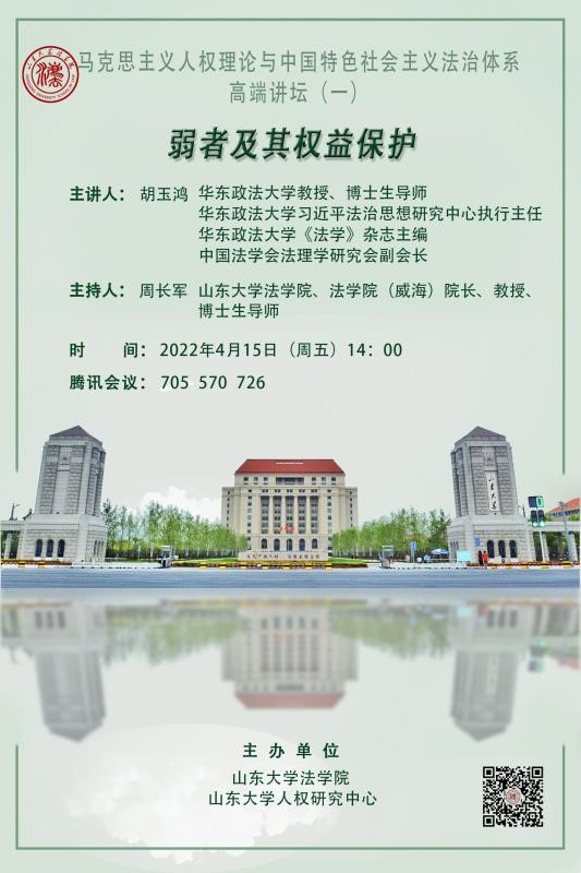 4月15日下午,“马克思主义人权理论与中国特色社会主义法治体系高端讲坛”第一讲顺利举办。华东政法大学习近平法治思想研究中心执行主任、《法学》杂志主编胡玉鸿教授以《弱者及其权益保护》为题,与山大taptap点点体育师生共飨了一场思想盛宴。