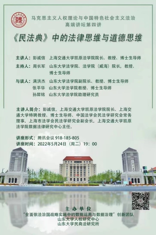 5月24日,上海交通大学凯原taptap点点体育院长彭诚信教授应邀在“马克思主义人权理论与中国特色社会主义法治体系高端讲坛”第四讲中,以《<民法典>中的法律思维与道德思维》为题作了一场精彩的学术报告。