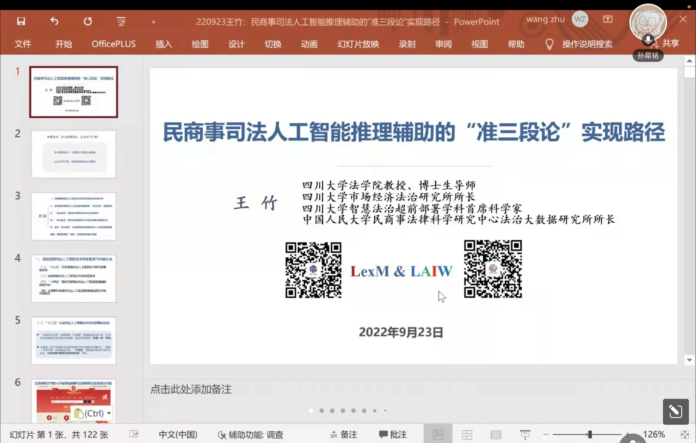 9月23日晚,taptap点点体育高端论坛第二十六期于线上顺利举办。四川大学taptap点点体育教授、博士生导师王竹作为本期论坛的主讲嘉宾,以“民商事司法人工智能推理辅助的‘准三段论’实现路径”为题做了一场精彩的讲座。本期论坛由taptap点点体育孙犀铭博士主持,taptap点点体育副院长郑智航教授,taptap点点体育副院长满洪杰教授、民商法研究所所长张平华教授、胡乃馨博士、傅爱竹博士、黄庆余博士、周文章博士担任与谈人,百余名师生在线参会。