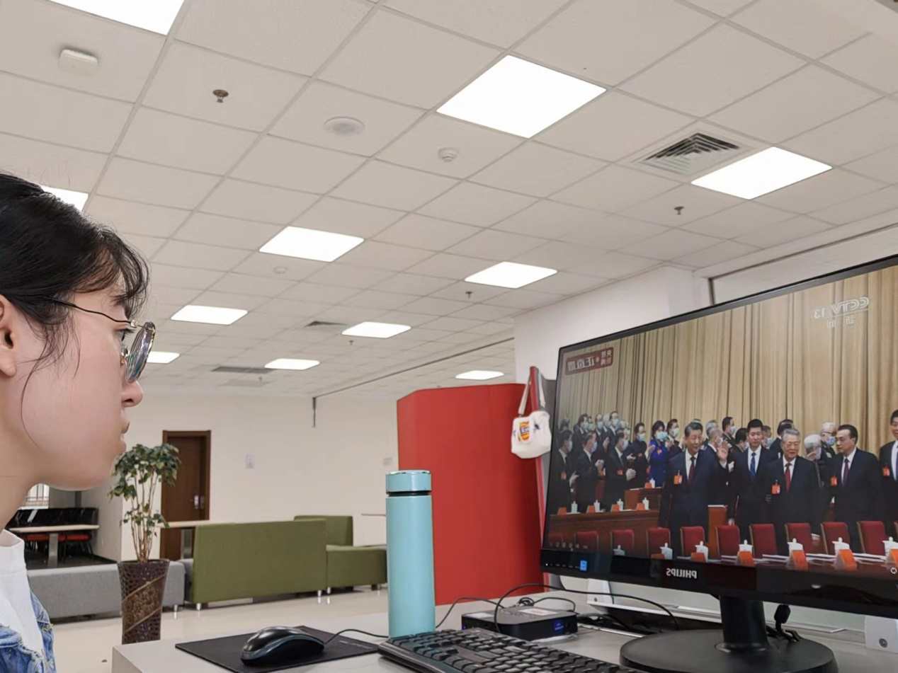 师生代表在学院图书馆认真收听收看