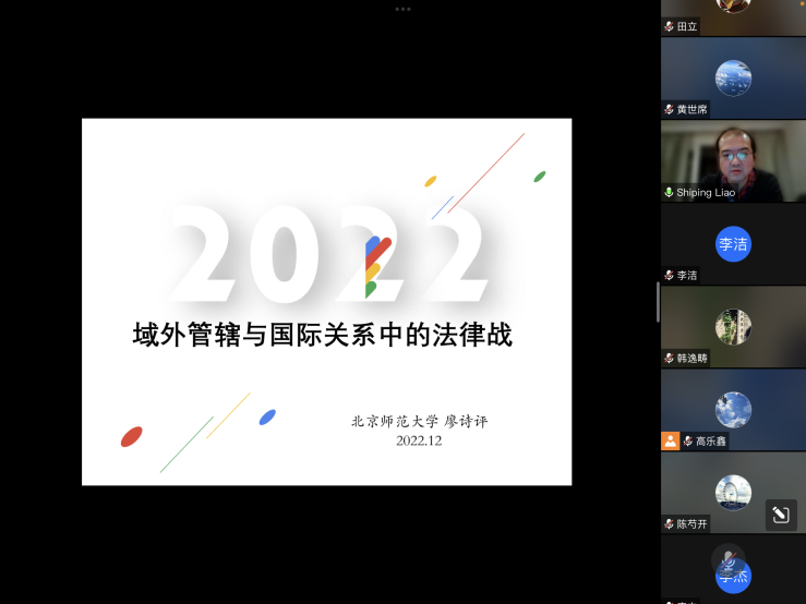 12月10日晚,taptap点点体育主办的山大法学涉外法治人才培养高端论坛第十八讲于线上顺利举办。北京师范大学taptap点点体育教授、博士生导师廖诗评以“域外管辖与国际关系中的法律战”为题做了一场精彩的学术讲座。本次讲座由taptap点点体育教授、博士生导师黄世席担任主持人,华东政法大学国际taptap点点体育副教授韩逸畴,西北大学taptap点点体育教授、硕士生导师王秀梅,taptap点点体育国际法研究所助理研究员田立、国际法研究所助理研究员高乐鑫、国际法研究所李洁博士担任与谈人,线上参会师生百余人。