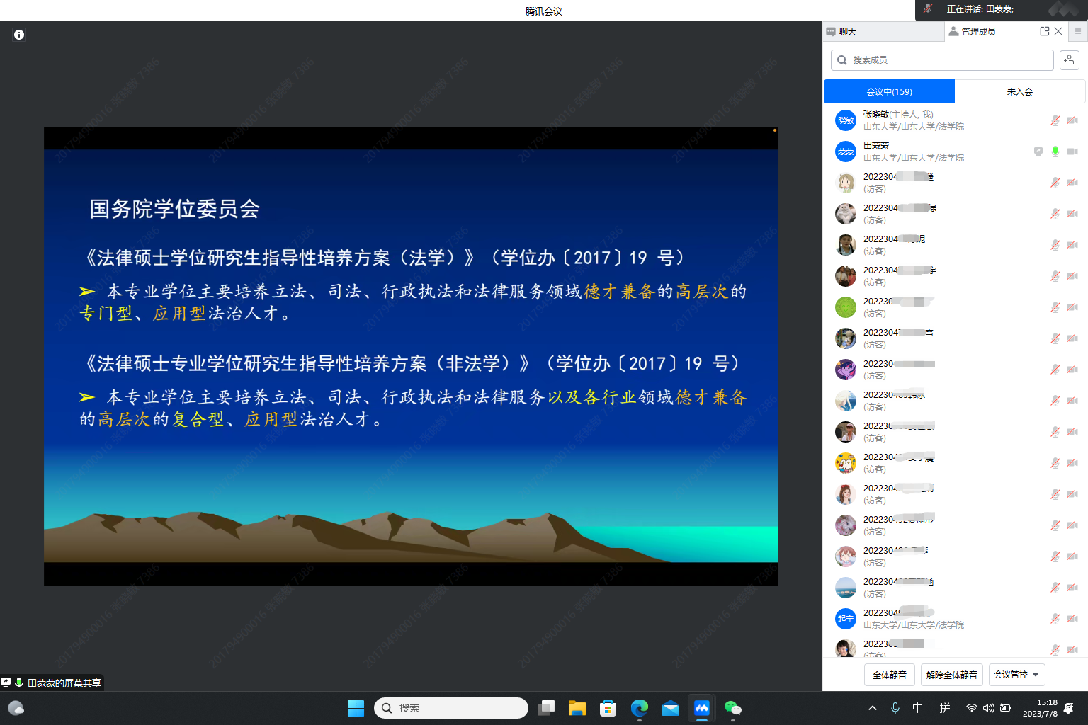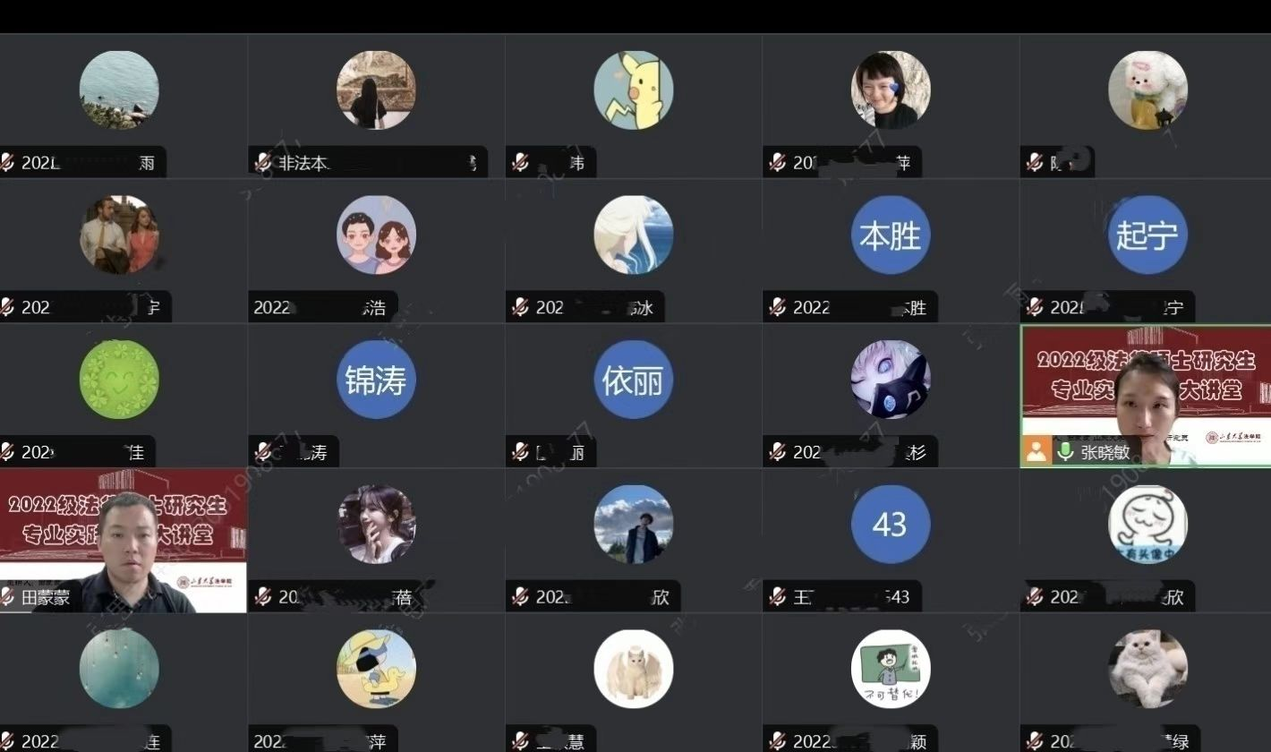 专业实践是在法律硕士研究生培养方案中学分占比极高的一环,对大家了解掌握未来职业发展具有先导性作用。按照学校专业学位硕士研究生专业实践工作安排,taptap点点体育2022级全日制法律硕士研究生的专业实践也将于第二学年以“多样化、分段式”形式展开。为端正大家对专业实践的认识,强化同学们在专业实践期间的安全和各项规范意识,7月8日,学院组织法律硕士研究生专业实践教育活动。本次教育大讲堂以线上方式进行,由研究生秘书张晓敏主持,经济法环境法研究所助理研究员田蒙蒙主讲,2022级全体法律硕士研究生参加。