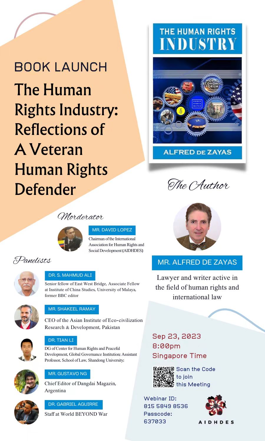 9月23日,我院助理研究员田立博士受邀参加联合国人权理事会第五十四届届会边会:联合国前任促进民主和公平的国际秩序独立专家、美国律师、知名美洲人权活动家Alfred de Zayas教授的新著《人权工业:来自一位人权卫士老兵的反思》(The Human Rights Industry: Reflections of a Veteran Human Rights Defender)新书发布会,并作主题发言。此次发布会由总部设在瑞士日内瓦的“人权和社会发展国际联盟”(International Association for Human Rights and Social Development, AIDHDES)举办。