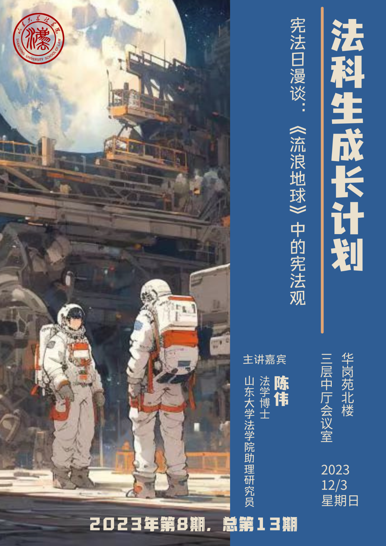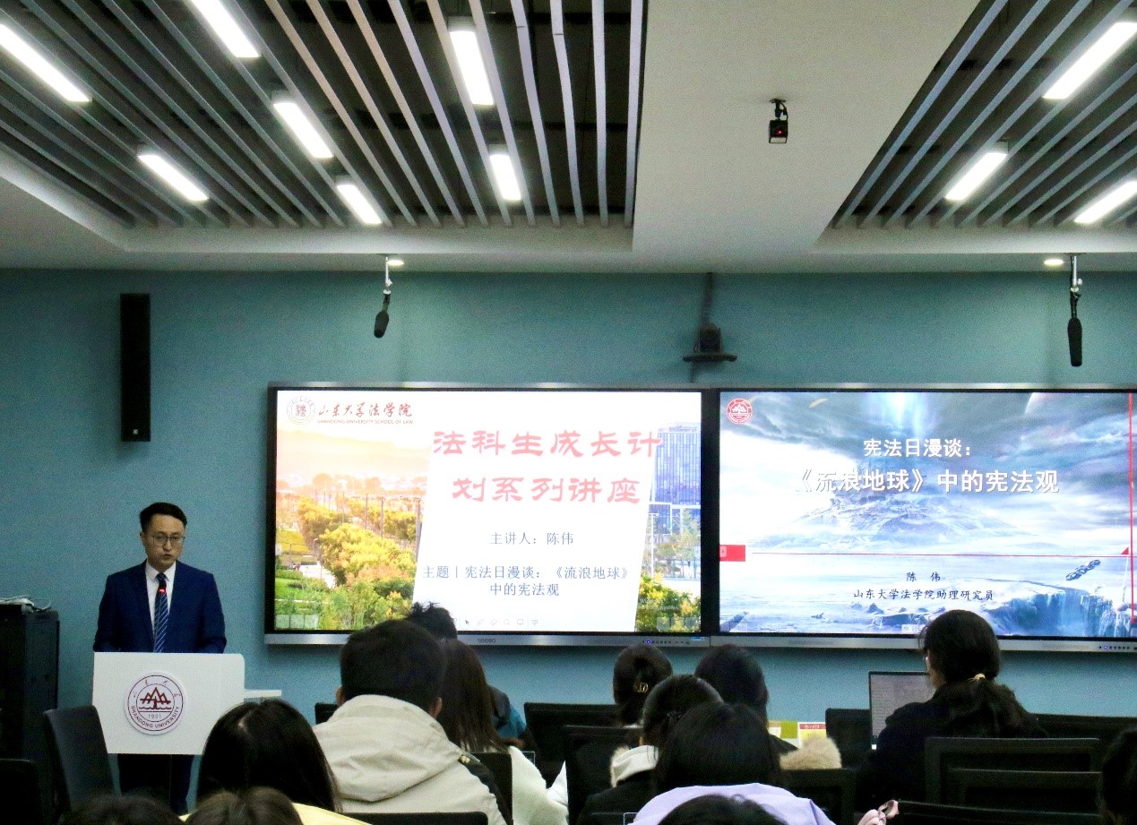陈伟从宪法遇上时间刻度、谁是宪法的守护者、如何实现代际合题、列举未竟话题等四个方面展开分享。他列举了《流浪地球》原著中的大事年表,结合原著预设的一百代人、2500年“流浪地球”计划,提出原著中的《危急法》是否属于宪法的设问,引导学生思考这部法律可能涉及的具体规定。他以《流浪地球》电影中的智能量子计算机MOSS和原著中的联合政府为例,阐释了“宪法守护者”的地位、功能和作用,从宪法监督的角度解读了“流浪地球”计划能够得以持续实施的原因。随后,借用“原旨主义”与“活的宪法”两种宪法解释方法,分析了如何实现“流浪地球”计划的代际合题。最后,他列举了“流浪地球”计划中的生育制度等内容,认为原著中这些与宪法相关的未竟话题值得继续探究。