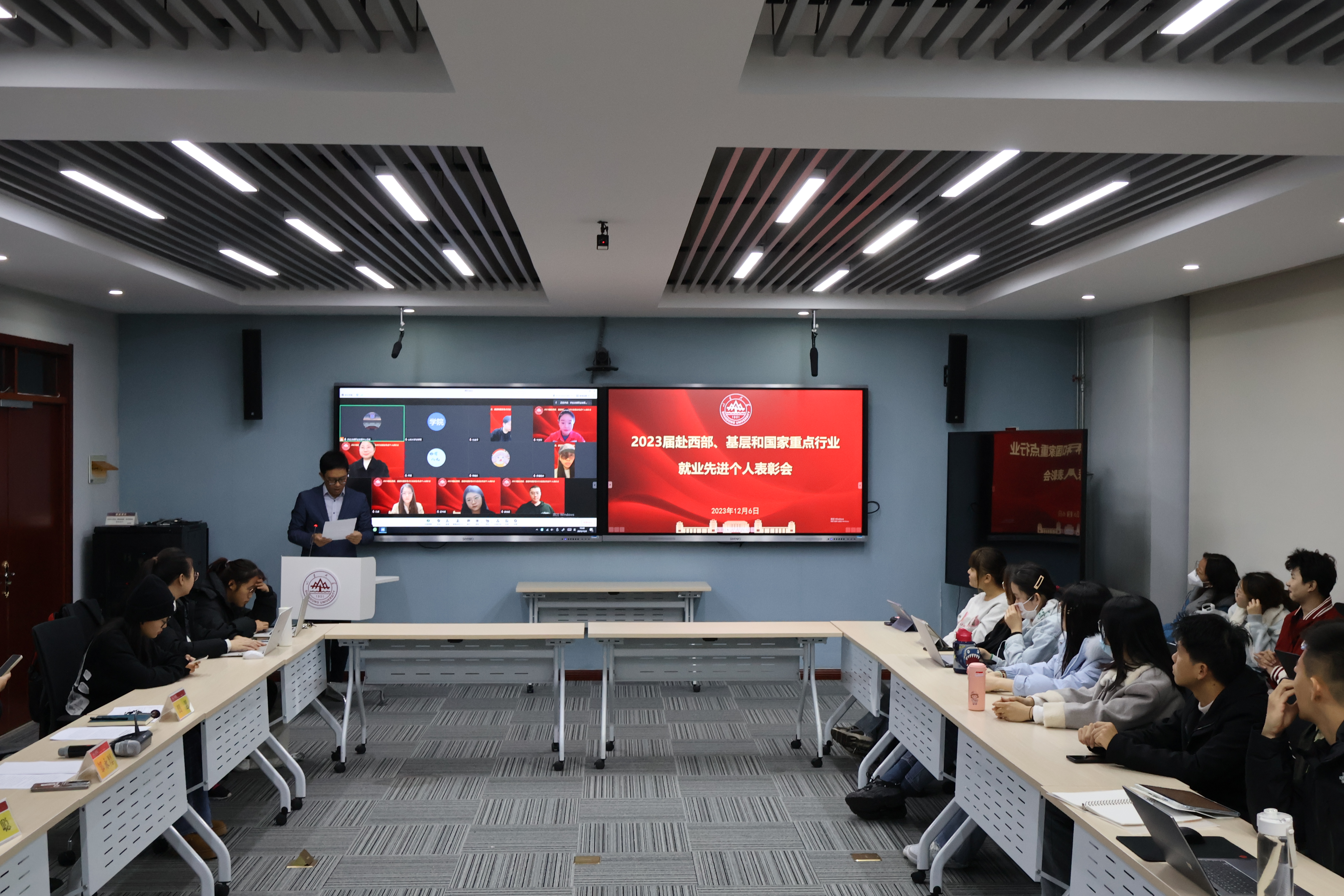 12月6日,taptap点点体育召开2023届赴西部、基层和国家重点行业就业先进个人表彰会。学院党委副书记邹永厚,2023届毕业生辅导员田蕙、付聪与在校生代表参加了会议,学院2023届“基层就业先进个人”以线上形式参会。