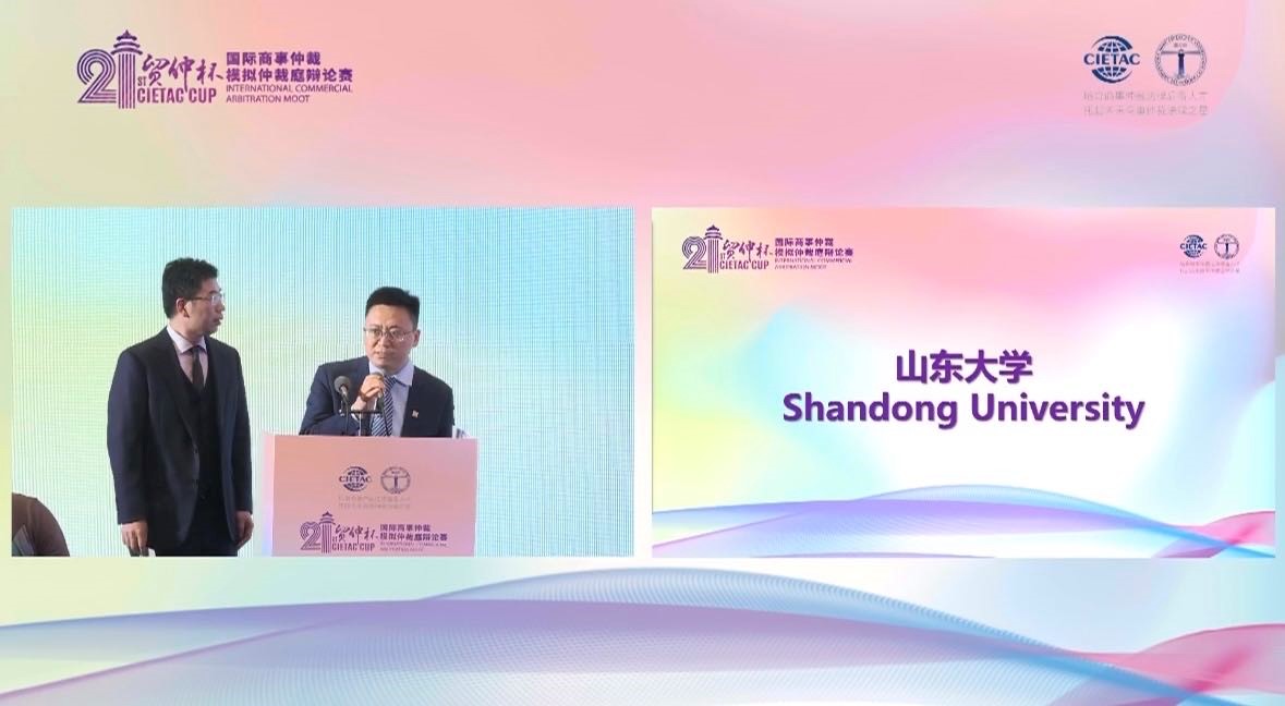 11月29日至12月8日,由中国国际经济贸易仲裁委员会主办的第二十一届“贸仲杯”(CIETAC CUP)国际商事仲裁模拟仲裁庭辩论赛顺利举行。经过激烈角逐,我校代表队荣获全国二等奖。个人奖项中,尹睿同学获得本届比赛“突出贡献奖”。