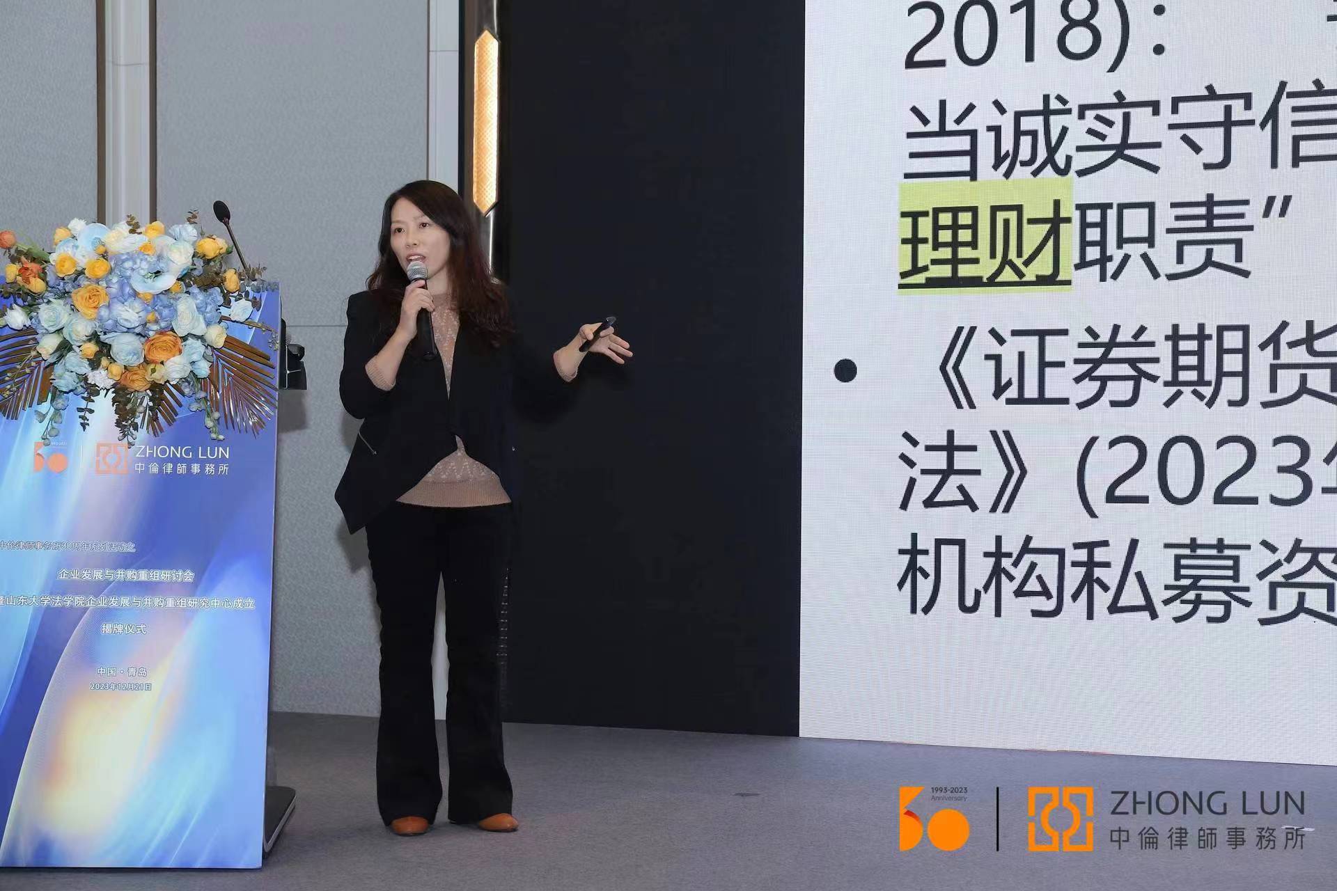 揭牌仪式后,举行了企业发展与并购重组研讨会,柴瑞娟教授作了《资管机构信义义务及风险防控》的主题发言。