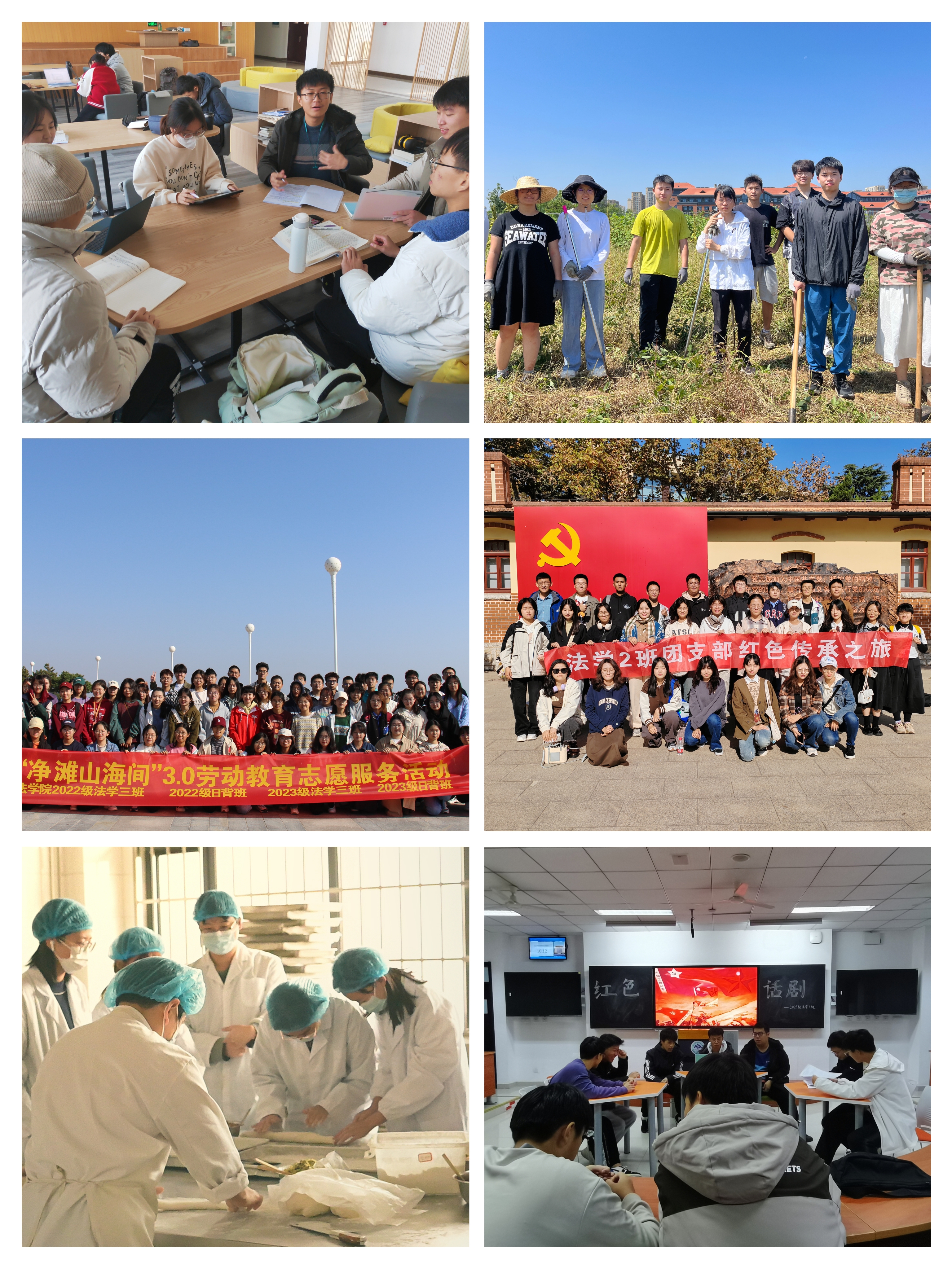 获得立项的各班级结合学生成长成才的实际需求,精心设计活动内容,积极创新活动形式。2022级法学1班创设个性化学习讨论小组,互相鼓励监督,共同营造积极向上、良性竞争的学习环境,推进学风建设。2022级法学2班以宿舍为单位开展交流谈心活动,充分发挥班委和宿舍长职责,帮助同学解决困难。2022级法学3班建设“山外青叁”班级品牌,通过“妙法生花”农场建设活动、“净滩山海间”滩涂湿地保护活动、“糕兴艺点”糕点水饺制作活动、“晚安山青”群楼熄灯活动等,带动同学们挥洒汗水、实践青春,以实际行动诠释“奋斗正当时,劳动正青春”的拼搏精神。2023级法学1班、2班同学走出校园,赴中共青岛党史纪念、五四广场、中山公园等地,从革命历史中汲取智慧和力量,增强砥砺奋进的信心和勇气。2023级法学3班结合新生班级特点,以学习环保法为切入点,举办破冰活动、净滩活动、经验分享交流班会和理论学习班会,增强班级凝聚力。2023级中日经贸法律特色班举办主题观影活动,从历史的镜头中感悟鲜活的社会主义核心价值观,传承不朽的精神追求。