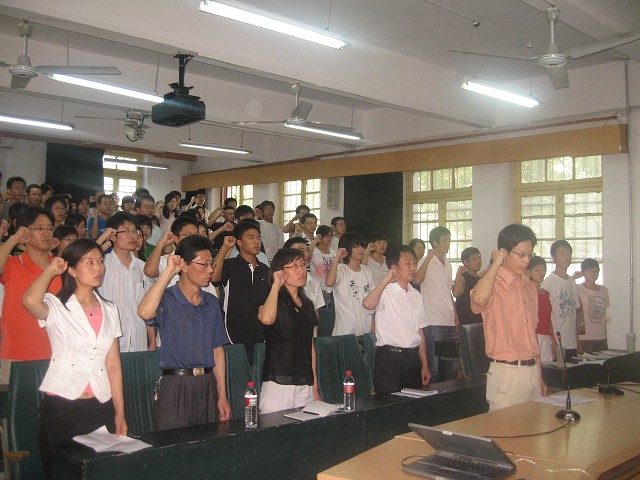 大会在雄壮的《国歌》中开始。接着在领誓人 徐会平 老师带领下,全体新党员起立,举起右手,面向党旗,庄严宣誓。在雄壮高昂的宣誓声中,同学们作出了对党对人民最庄严的承诺。随后,老党员代表2005级本科生蒋赛静、新党员代表2007级本科生李静怡作了发言。