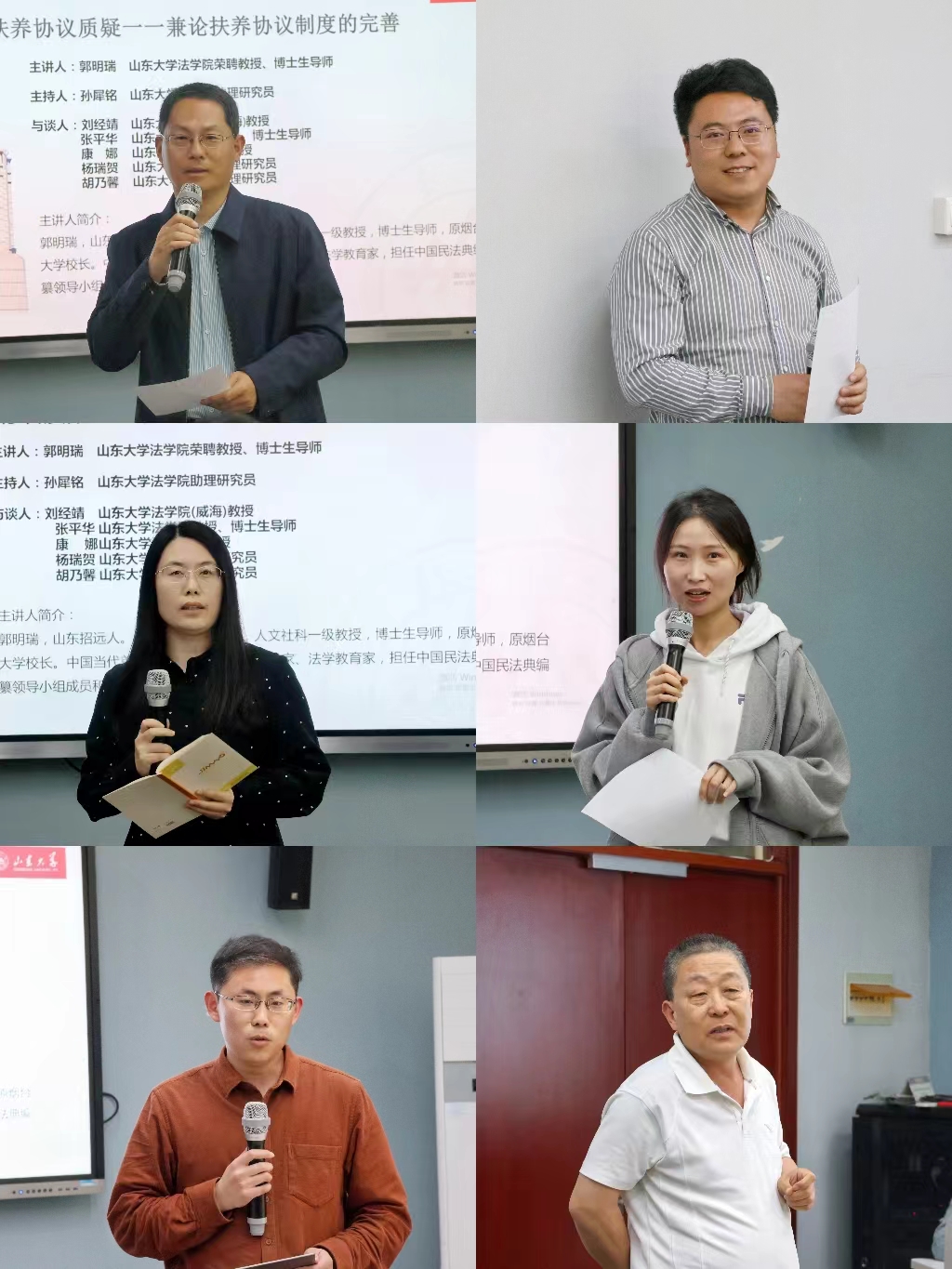 与谈环节,孙犀铭就讲座内容进行总结,刘经靖、瞿灵敏、秦伟、康娜、杨瑞贺、胡乃馨先后结合自身实际感悟,就讲座内容的相关问题分享了个人思考及学术观点。秦伟最后表示法学研究一定要立足于解决现实问题,并从扶养角度分享个人观点。