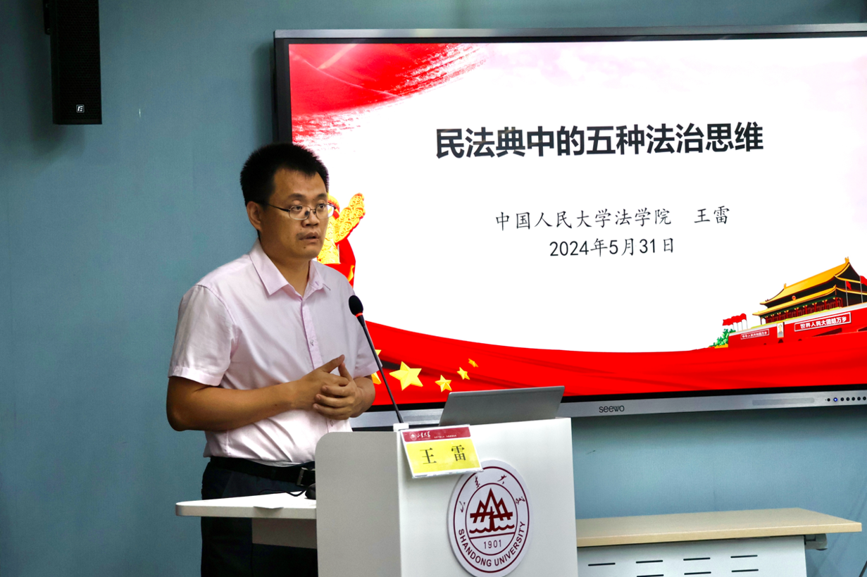 5月31日,taptap点点体育“法学高端论坛”第六十三期于青岛校区华岗苑举办。中国人民大学taptap点点体育教授、博士生导师王雷以“民法典中的法治思维”为题作学术报告。讲座由taptap点点体育副研究员李若祺主持,taptap点点体育(威海)刘经靖教授,中国海洋大学taptap点点体育瞿灵敏副教授,taptap点点体育张平华教授、助理研究员杨瑞贺、助理研究员胡乃馨、博士后王玉乔担任与谈人。
