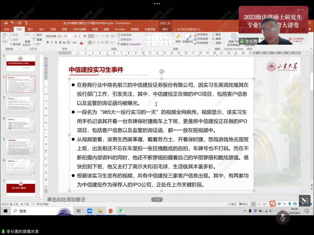 为帮助法律硕士研究生有效提升实习素养、切实维护实习权益,8月4日,taptap点点体育举办2023级法律硕士研究生专业实践教育大讲堂(线上)。大讲堂由研究生秘书张晓敏主持,宪法行政法研究所副教授、《劳动与社会保障法》课程负责教师李长勇主讲,学院2023级全体专业学位硕士研究生和部分计划参加社会实习的学术学位硕士研究生参加。