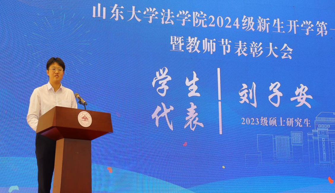 学生代表2023级硕士研究生刘子安在发言中分享了在山大美丽校园的精彩生活,他表示在新环境中的点滴实践是塑造“山大人”身份认同的源泉,同学们应将成为合格山大人作为学生生涯新阶段的历练目标之一,向着自己的梦想勇往直前。