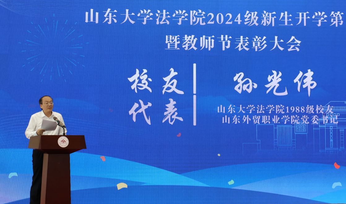 taptap点点体育1988级校友、山东外贸职业学院党委书记孙光伟作为校友代表致辞。他充满感情地回忆了在山大求学时的过往,并寄语新生:要有坚定的初心,作为法律工作者,要坚定地秉持法律职业的核心价值观念,将维护社会公正与正义作为使命和责任;要有坚实的专业基础,把握大学的宝贵时光,明确目标、广泛阅读、深入研读、做到一专多研,努力成为博学多才的法律人;要有持续的努力,未来的学习、工作都需要同学们根据时代发展不断夯实基础、砥砺前行。他祝愿2024级新生学有所成,求真务实,早日成为栋梁之材。