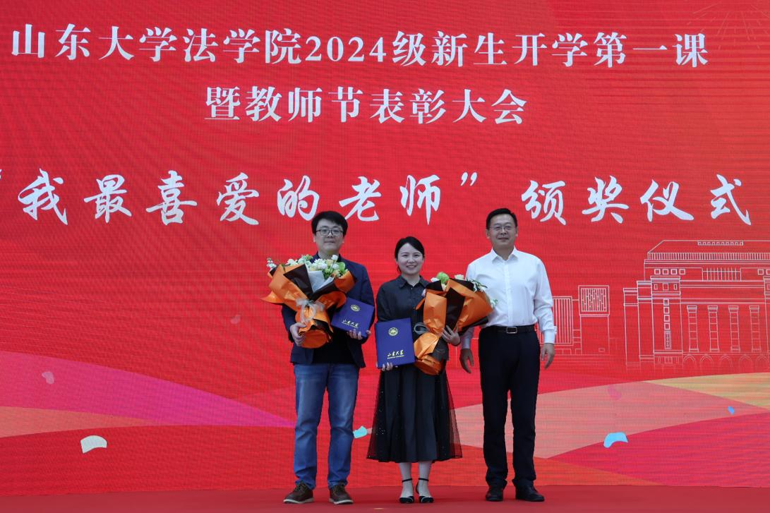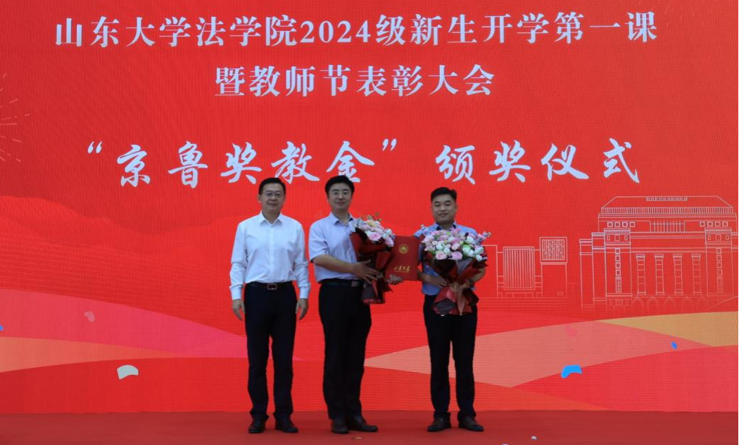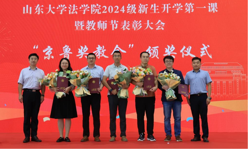 律所执行主任赵阳在“京鲁奖教金”颁奖仪式环节中宣读2024年获奖名单并致辞。山东京鲁律师事务所自2018年起在学院设立奖教金,弘扬尊师重教风气,支持山大法学教育。赵阳表示奖教金的设立是以维护公平正义为初心,激励广大教师爱岗敬业,为社会培养优秀人才。赵阳与京鲁所副主任张泽军为获奖教师代表李云龙、孙康、田立、范毅强、王阳颁发证书。于向明为山东京鲁律师事务所颁发捐赠证书。