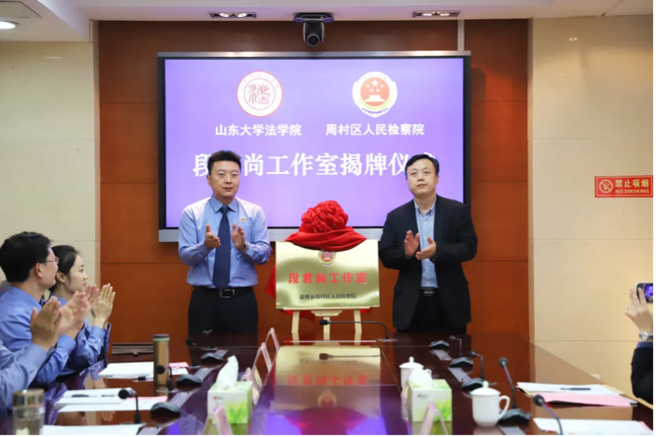 孙健介绍了段君尚的基本情况、工作经历和特长优势,并代表院党组及全体干警对段君尚同志到周村区人民检察院挂职锻炼表示热烈欢迎。周长军和孙健为“段君尚工作室”揭牌。