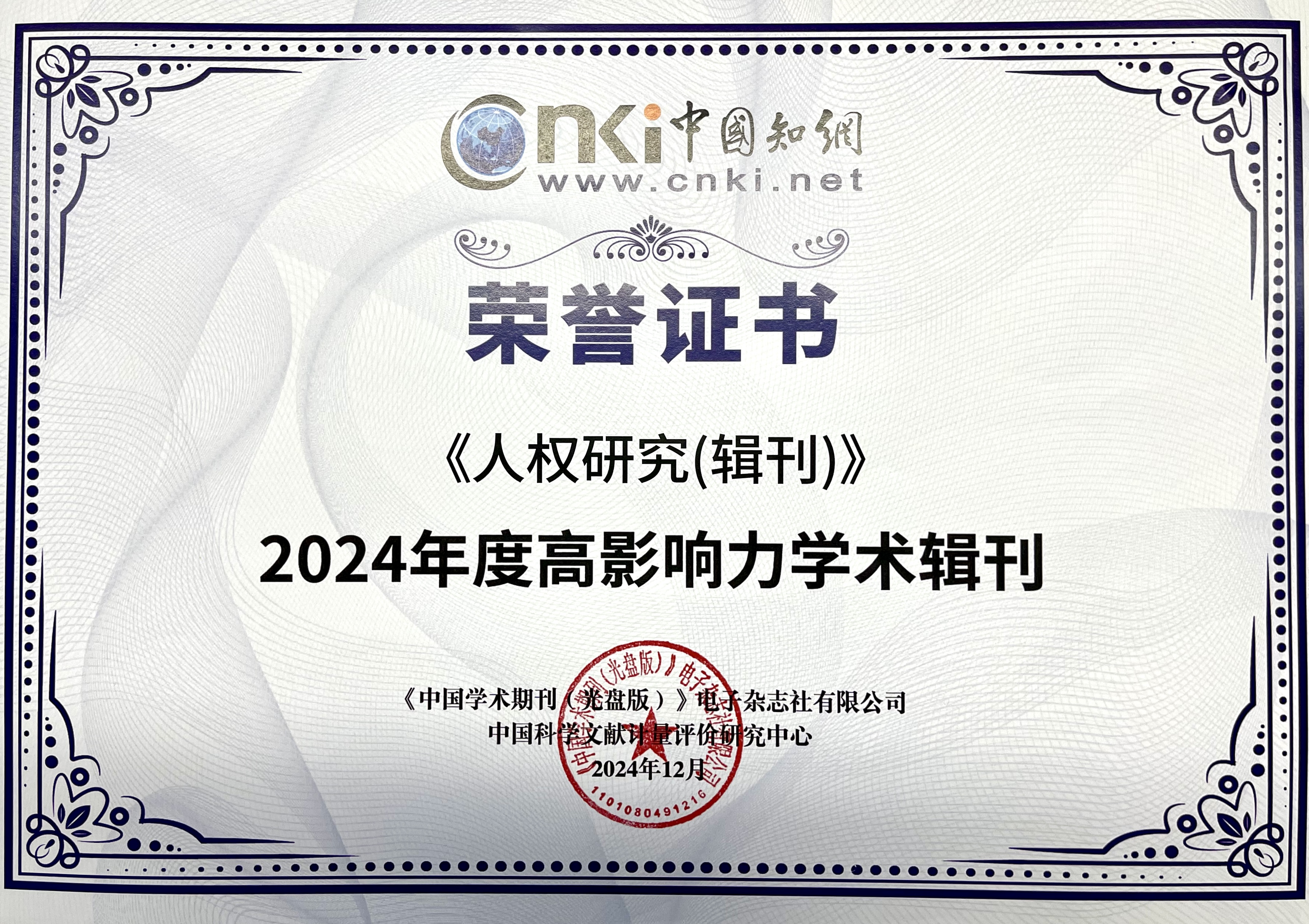 《人权研究》入选“2024年度高影响力学术辑刊”