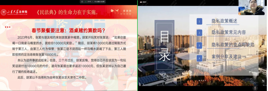 坚持党建引领,助力基层治理,团队联合地方基层党支部和其他学生党支部开展普法宣传活动。团队成员深入农村社区,通过基层党支部联系群众,为民事纠纷化解贡献智慧,为预防网络电信诈骗提供建议。宣讲团成员还联合我校多个学院学生党支部,以《民法典》知识普及和电商平台个人信息保护为主题开展两场线上宣讲会,探索“党建+朋辈指导”的普法模式。