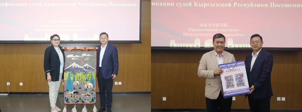 最后,于向明与吉尔吉斯斯坦最高法院法官代表阿依达·赛达克玛托娃、司长达尼亚尔·苏尤诺夫互换了象征友好合作的纪念品。双方表示将充分发挥自身优势,加强涉外法治合作,助力法治人才培养,进一步深化对上合组织法治研究,对未来合作给予高度肯定与期待。