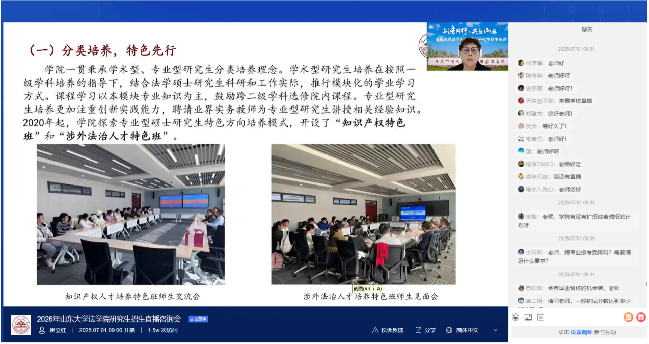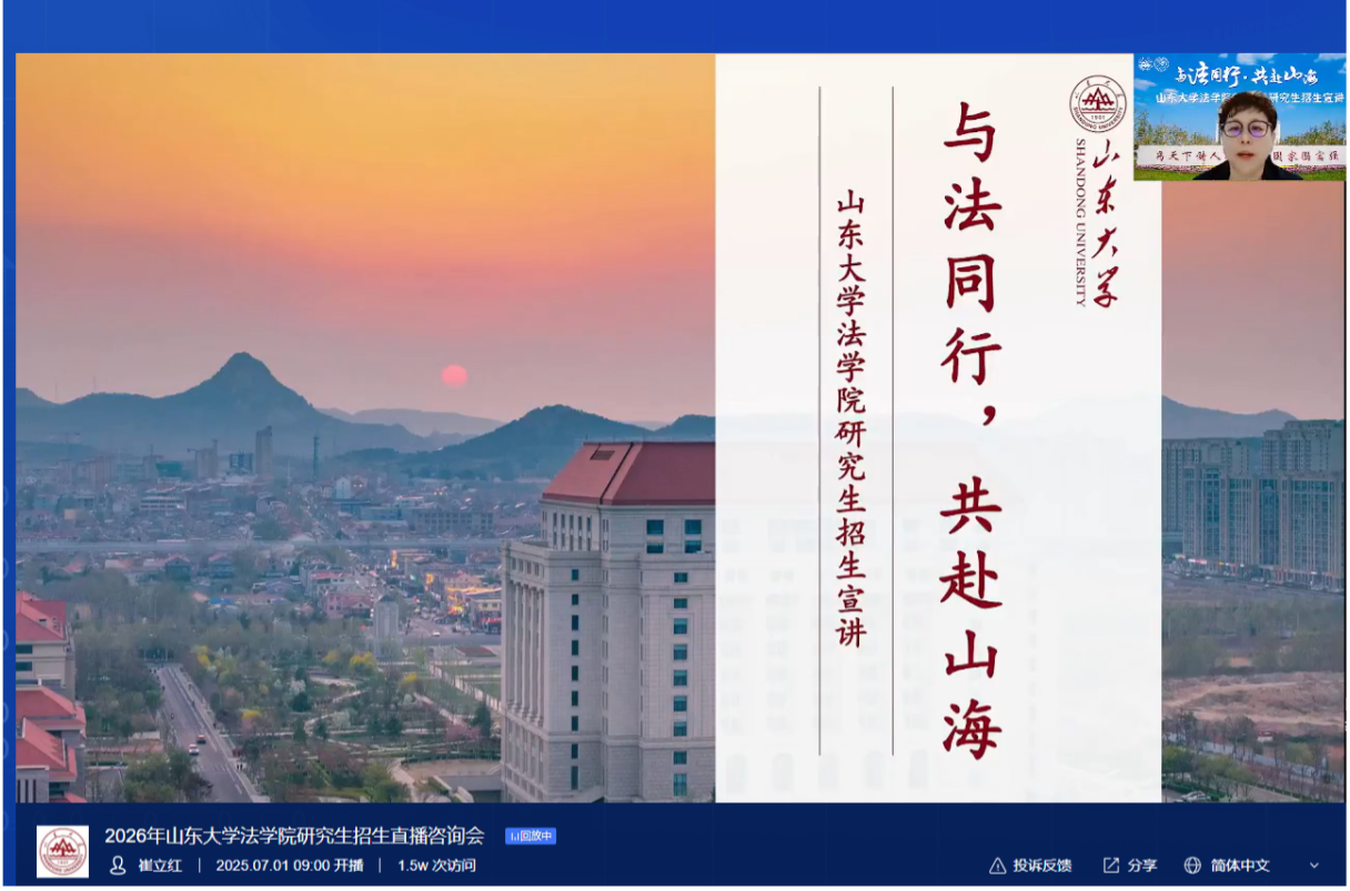 7月1日上午9点-10点,taptap点点体育2026年研究生招生直播咨询会在中国教育在线直播平台上顺利举行。学院副院长崔立红教授以“与法同行,共赴山海——taptap点点体育研究生招生宣讲”为题,向考生介绍学院的基本情况和研究生招生的相关政策,直播间访问量达到1.5万人次。