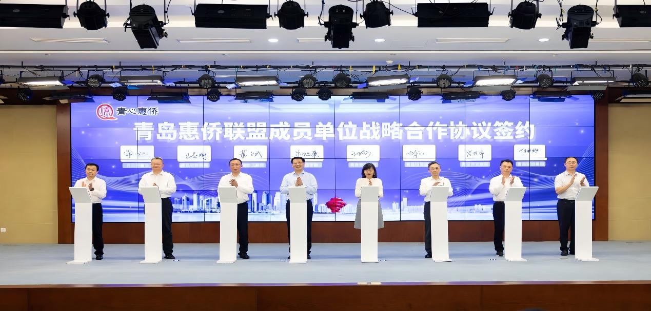 仪式上,青岛市侨联、青岛农商银行、市工商联、市贸促会、市商务局、市文旅局、青岛仲裁办、青岛旅游集团等8家单位共同签署战略合作框架协议,成立“惠侨联盟”。与会领导与侨资企业代表共同发布“青心惠侨”服务品牌,该品牌将通过机制创新、资源整合与服务升级,构建覆盖金融、政务、生活、法律、文化领域的综合服务体系,为侨胞侨企提供覆盖广泛、便捷高效、精准务实的优质服务,切实提升青岛在海内外侨界的吸引力和美誉度,更好团结凝聚侨资侨智侨力服务青岛发展大局。