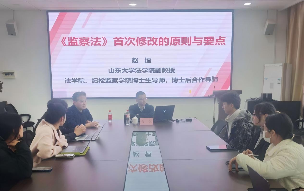讲座中,赵恒首先介绍《监察法》制定与首次修改的概况,阐释《监察法》首次修改的重大法治意义,重点从监察工作原则、监察权限、监察程序等方面进行深入分析,同时又根据各个讲座的实际需要做进一步探讨分析。