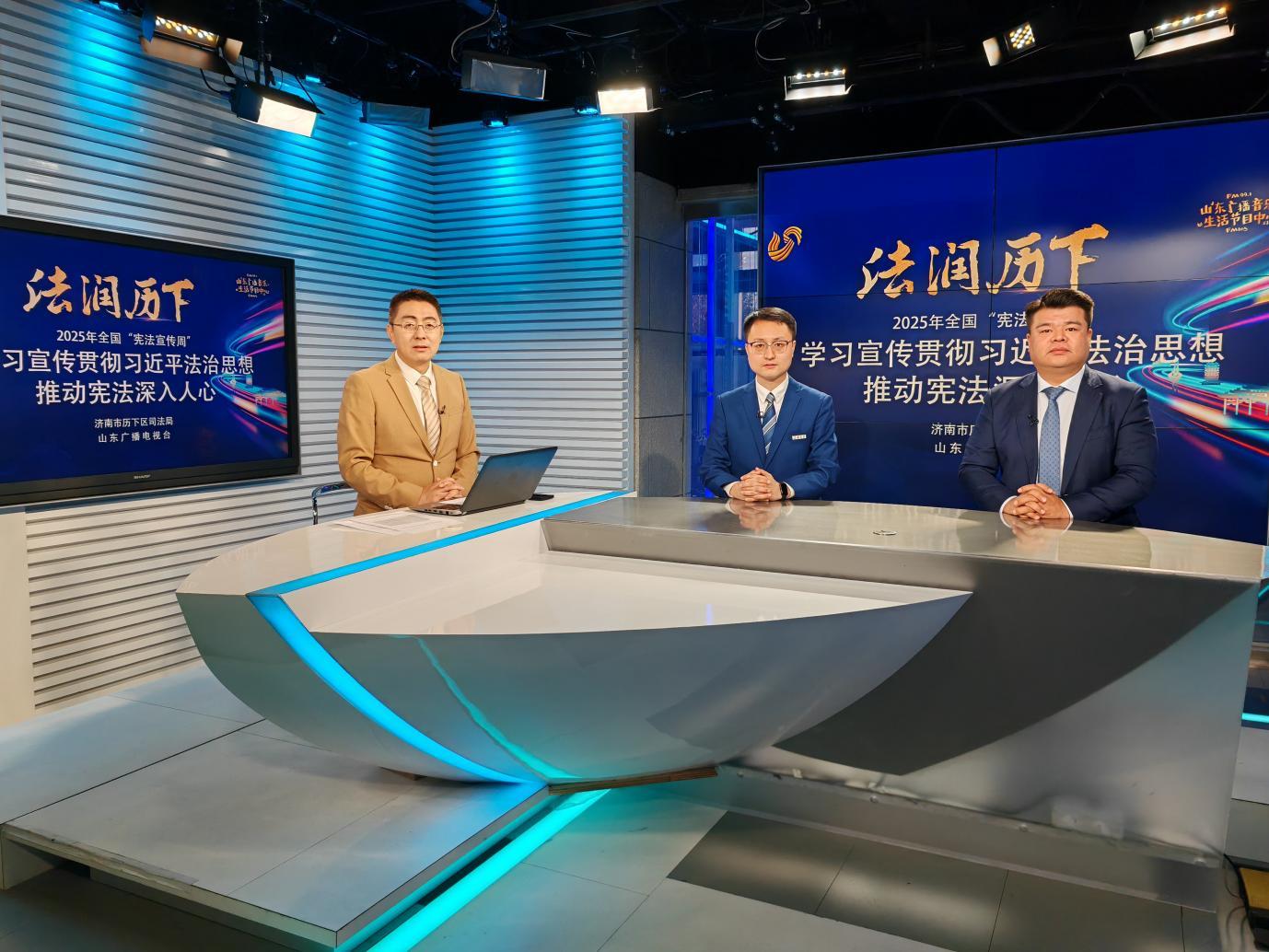 12月6日下午,历下区司法局联合山东广播电视台制作的2025年“宪法宣传周”主题活动《法润历下》普法直播节目第167期顺利播出。本期节目的主题为“学习贯彻习近平法治思想推动宪法深入人心”,taptap点点体育助理研究员陈伟博士担任主讲嘉宾,山东圣义(济南自贸区)律师事务所执行主任刘诚发担任与谈嘉宾,山东广播电视台谭超杰担任本期节目的主持人。