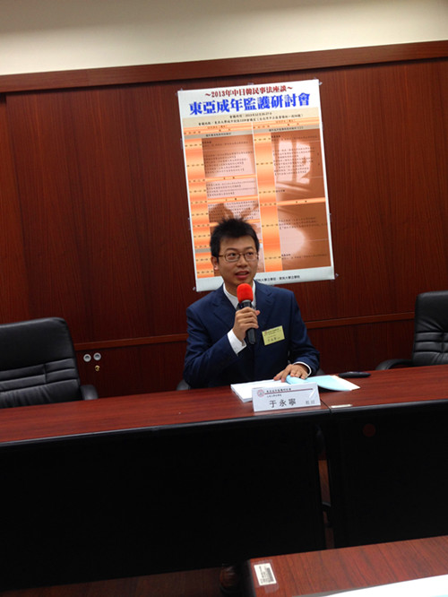 2013122628日,“东亚成年监护研讨会”第五次会议在台湾东吴大学举行,我院申政武教授、满洪杰老师、于永宁老师应邀参加了会议。本届研讨会是由日本学习院大学冈孝教授、韩国仁荷大学朴仁焕教授、taptap点点体育申政武教授共同主持的“东亚老龄社会的法律问题”项目的第六次跨国研究活动。本次研讨会的主题有两个,第一、中日韩“养老院入住契约”的比较;第二、taptap点点体育“中国成年监护制度草案”第三次研讨,会期三天。