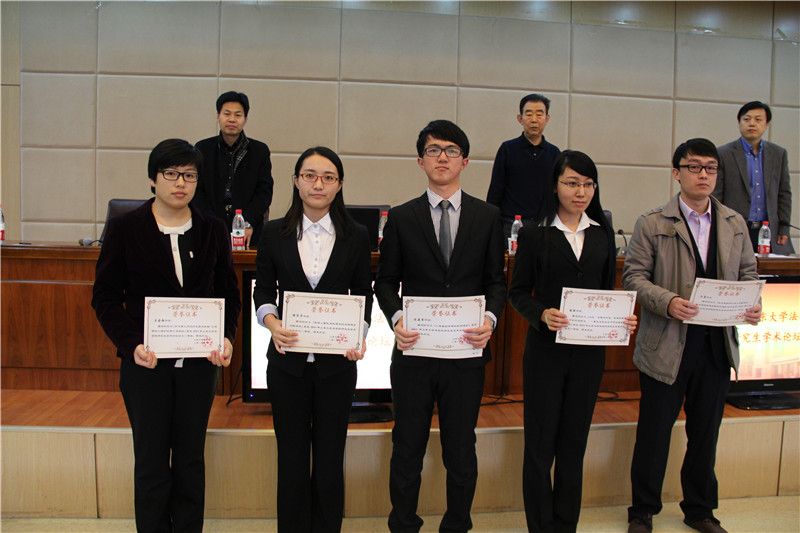 开幕式由我院2013级硕士生张爽同学主持,周长军副院长介绍了本次论坛的组织过程。本次论坛,同学们的参与热情极高。共收到博士生投稿40篇,硕士生39篇。评审采取匿名的形式,在评审的过程中组织谈话,进行知网检测,评审程序流程清晰。共选出博士生一等奖7篇,二等奖5篇,硕士生一等奖8篇,二等奖7篇。一等奖奖金1500元,二等奖奖金1000元,重在精神奖励。齐向东副书记宣布获奖了名单,宣布完获奖名单后,郭明瑞、周长军、齐向东共同为获奖的同学颁奖并合影留念。