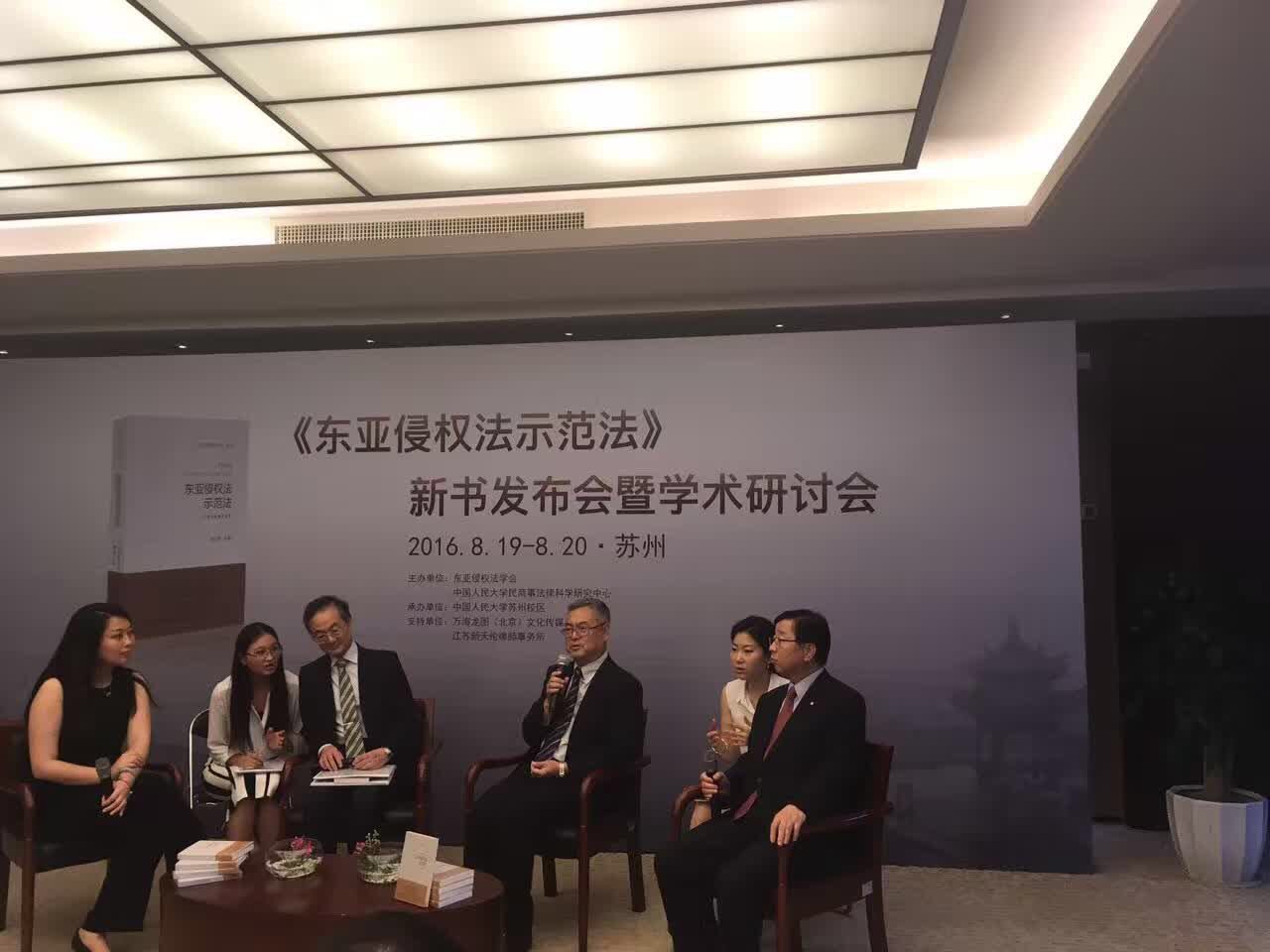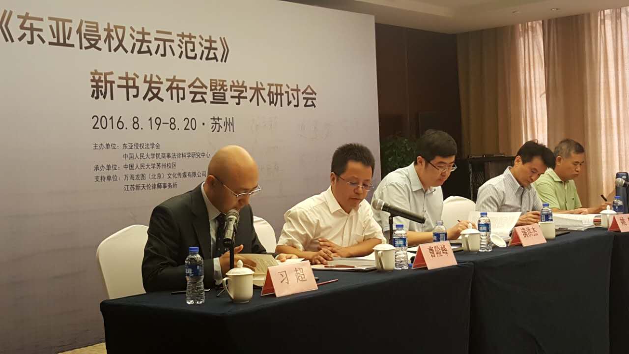 2016年8月19日-20日,满洪杰副教授应邀赴中国人民大学苏州校区参加了由东亚侵权法学会、中国人民大学民商事法律科学中心主办的“《东亚侵权法示范法》新书发布会暨学术研讨会”。会上发布了作为“东亚侵权法示范法”跨国项目研究成果的《东亚侵权法示范法》,并由北京大学出版社出版发行。来自日本一桥大学、大阪市立大学,韩国庆熙大学、东国大学,台湾地区东吴大学,香港中文大学、澳门大学,以及中国人民大学、清华大学、苏州大学、南京师范大学、南京中医药大学等高校和司法机关的专家学者40余人对东亚侵权法示范法进行了进一步的研究和探讨。