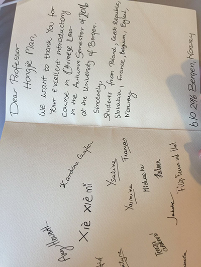 受挪威卑尔根大学邀请,和孔子学院总部“理解中国”孔子新汉学计划高级学者赴外讲学项目的支持,满洪杰副教授于2016年9月19日至10月6日在挪威卑尔根大学taptap点点体育开始并讲授了“中国法概论(An Introduction to Chinese Law)”英文课程。该课程为卑尔根大学2016年秋季学期新设选修课程,共20学时,计3学分。该院共20多名本科、研究生同学注册了并参加了课程的学习。满洪杰副教授的课程内容详尽,讲授生动,受到了广大同学的欢迎和好评,引发了同学们对中国法的学习热情。课程的开设,为挪威及其他欧洲国家的学生,开启了了解中国法律的窗口。
