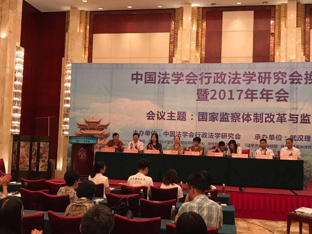 中国行政法学研究会2017年会于8月26日、27日在武汉举行,这次年会的主题是城市治理、国家监察体制改革与监察立法。杨海坤教授主持了国家监察体制改革与监察立法的发言和讨论,并被研究会聘为研究会顾问。我院博士生赵玮携论文参加了本次年会。