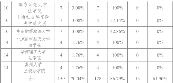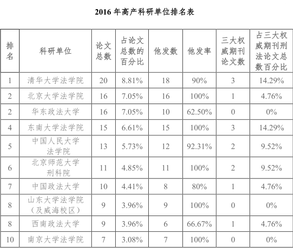 2016年,CLSCI期刊的227篇刑法学论文来自61家科研单位,平均每家单位发文3.72篇,超过此平均值的发文单位共16家,具体如下表所示: