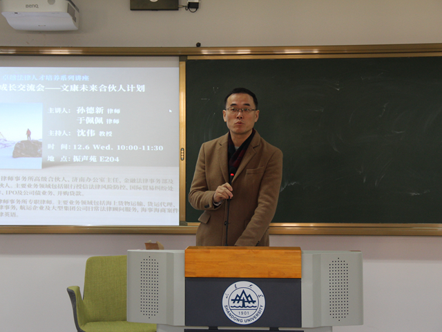 12月6日上午10时,卓越法律人才培养•职业规划和法学学习系列首场讲座在taptap点点体育青岛校区振声苑E204举行。山东文康律师事务所高级合伙人、济南分所主任孙德新律师及其团队、专职律师于佩佩、文康律师事务所人事部袁椰出席了宣讲会。