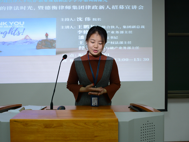 紧接着上台的是王隽律师,她为大家展示了德衡律师集团的发展脉络,介绍了不同的业务团队、集团现状及未来的发展方向,介绍了江平老先生为德衡的题字:“风雨兼程”、“万水千山”、“海阔天空”、“顺其自然”以及这背后对德衡律师集团的重要意义,并与在座同学一起畅想法律行业的未来。