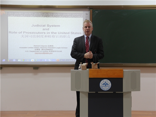 Richard Daynes检察官首先介绍了美国的司法特别是诉讼体系和制度。美国州法院分为州最高法院、州上诉法院、州地方法院三种法院,联邦法院分为联邦最高法院、联邦上诉法院、联邦地区法院三种法院。该体系主要分为联邦最高法院,13个联邦上诉法院(12个巡回法院、1个联邦巡回上诉法院),州最高法院、联邦地区法院、专门联邦法院、众多联邦机构三大层次。他还指出,州最高法院可以向联邦最高法院请求调查令。紧接着,Richard Daynes检察官解释了州与联邦法律冲突问题,点明联邦对宪法的解释高于州判例、联邦最高法院对美国的所有法律均有最高解释权。同时,他还阐释了州和联邦法院法官任命的基本情况,即联邦法院法官由总统任命,州法院法官由州长任命或者选举产生。