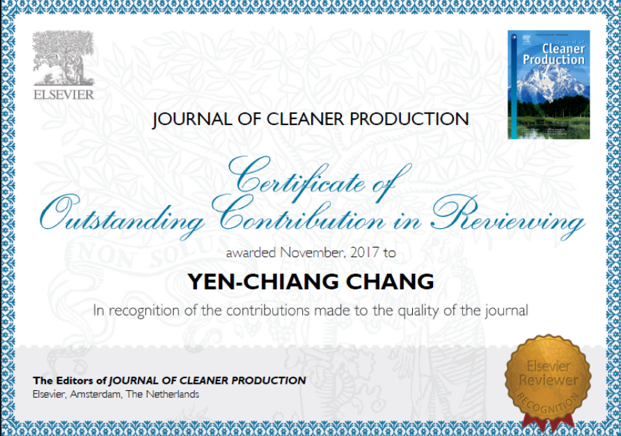 近日,国际知名刊物Journal of Cleaner Production(清洁生产杂志)授予我院张晏瑲教授“2017年优秀审稿专家Journal of Cleaner Production为国际知名SCI期刊,5年平均影响系数达6.207。该刊根据2017年全年度的审稿记录在全球范围内仅选出10位优秀审稿专家,我院张晏瑲教授获选,以表彰其在审稿过程中对论文质量把关的严实,以及其所提出的建议对论文质量实质提升的帮助。